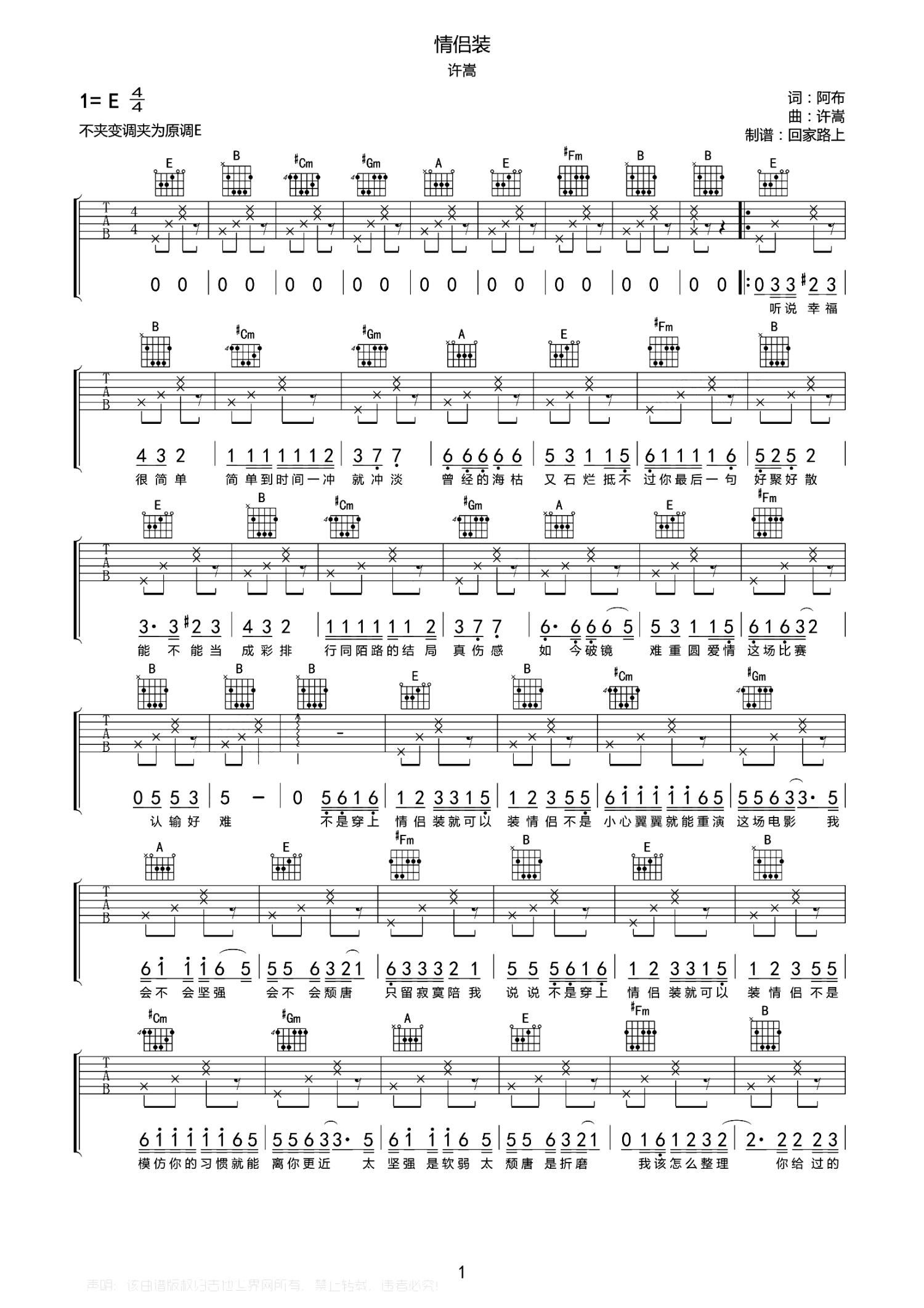 曲谱介绍: 许嵩《情侣装》吉他谱_E调吉他弹唱谱