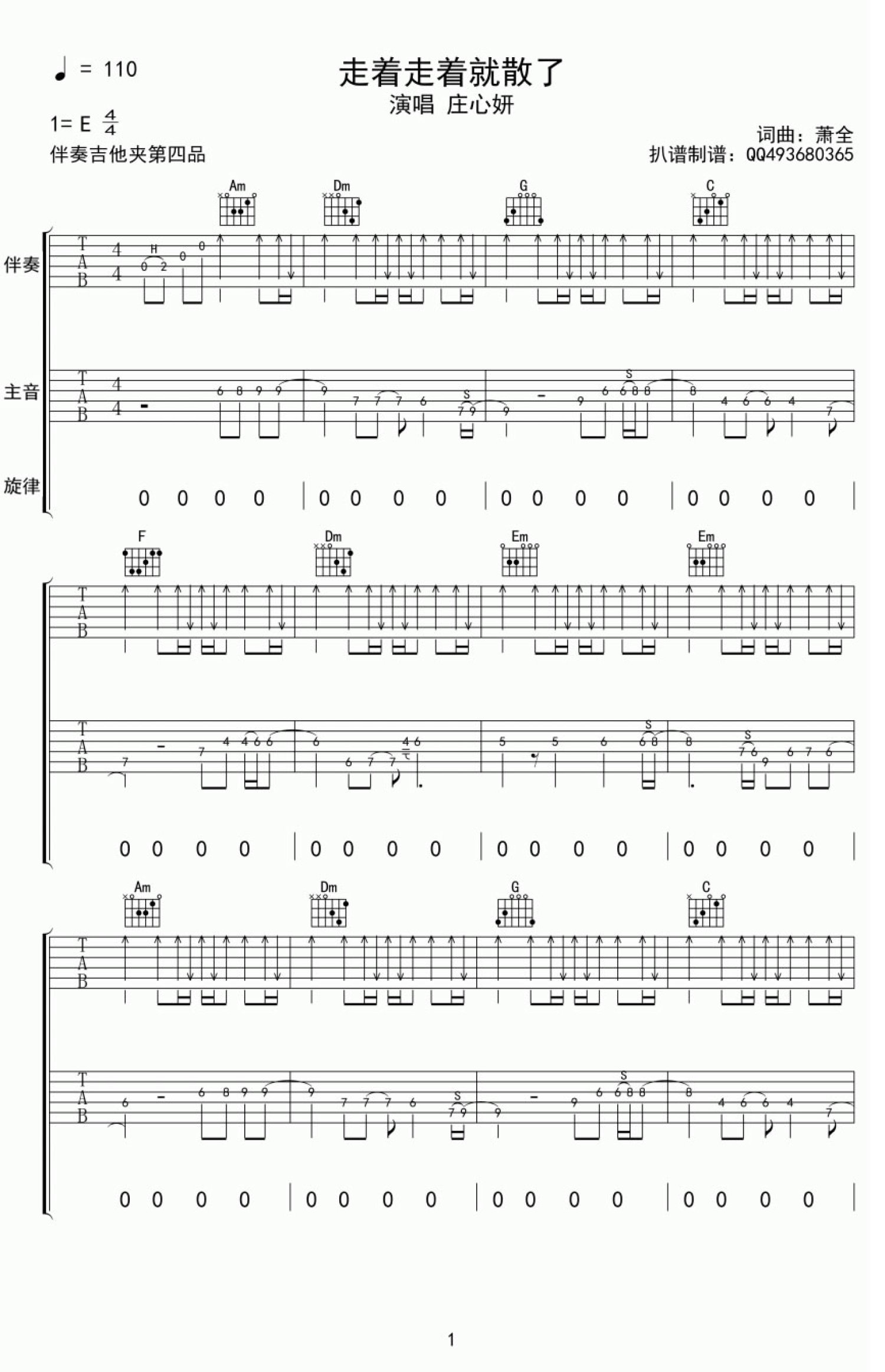 曲谱介绍: 副标题#e#庄心妍演唱《走着走着就散了》吉他谱,双吉他六线谱编配,E调,伴奏吉他夹四品。生命中的那些人,走着走着就散了;曾经的那个自己,走着走着就丢了。多数时间我们都忙忙碌碌的来不及伤春悲秋,只是当那时爱听的歌再一次响起时,就忍不住会回想。这样的旋律会把一首悲伤的歌词诠释的很果敢,人和人真的就像歌词里写的那样,有些时候走着走着就散了,无论是朋友还是恋人。#p#副标题#e#走着走着就散了吉他六线谱,庄心妍演唱,一首非常好听的网络热门歌曲。当前页面是七张曲谱的后面四张图片谱子。有多少无人能懂的不快乐,就有多少无能无力的的不舍,走着走着就散了,让多少人触景生情。生活与感情,现实与天真,唱出了多少人的心境变化,又有多少人能颠覆曾经的遗憾。