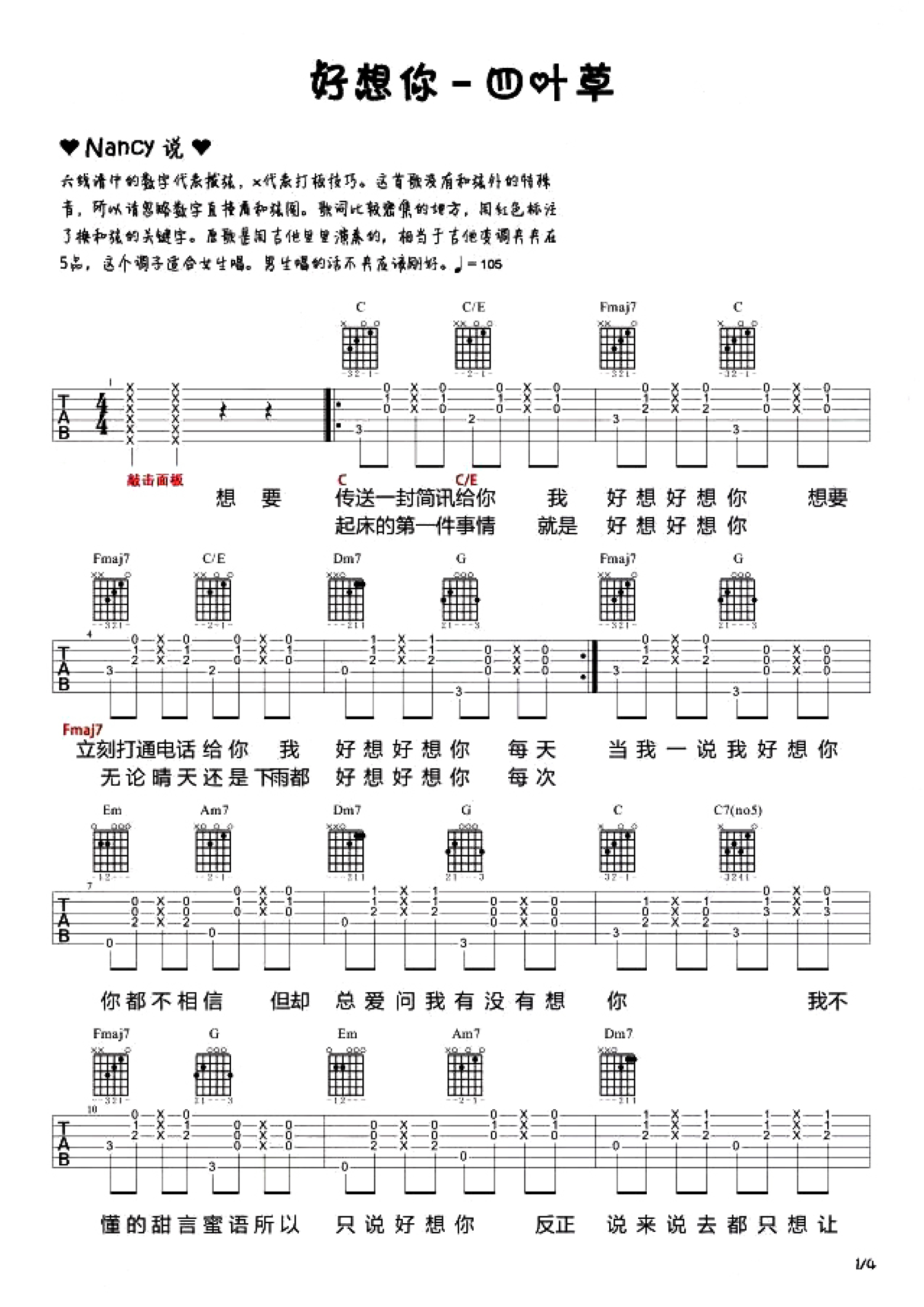 曲谱介绍: 四叶草《好想你》吉他谱_吉他弹唱谱