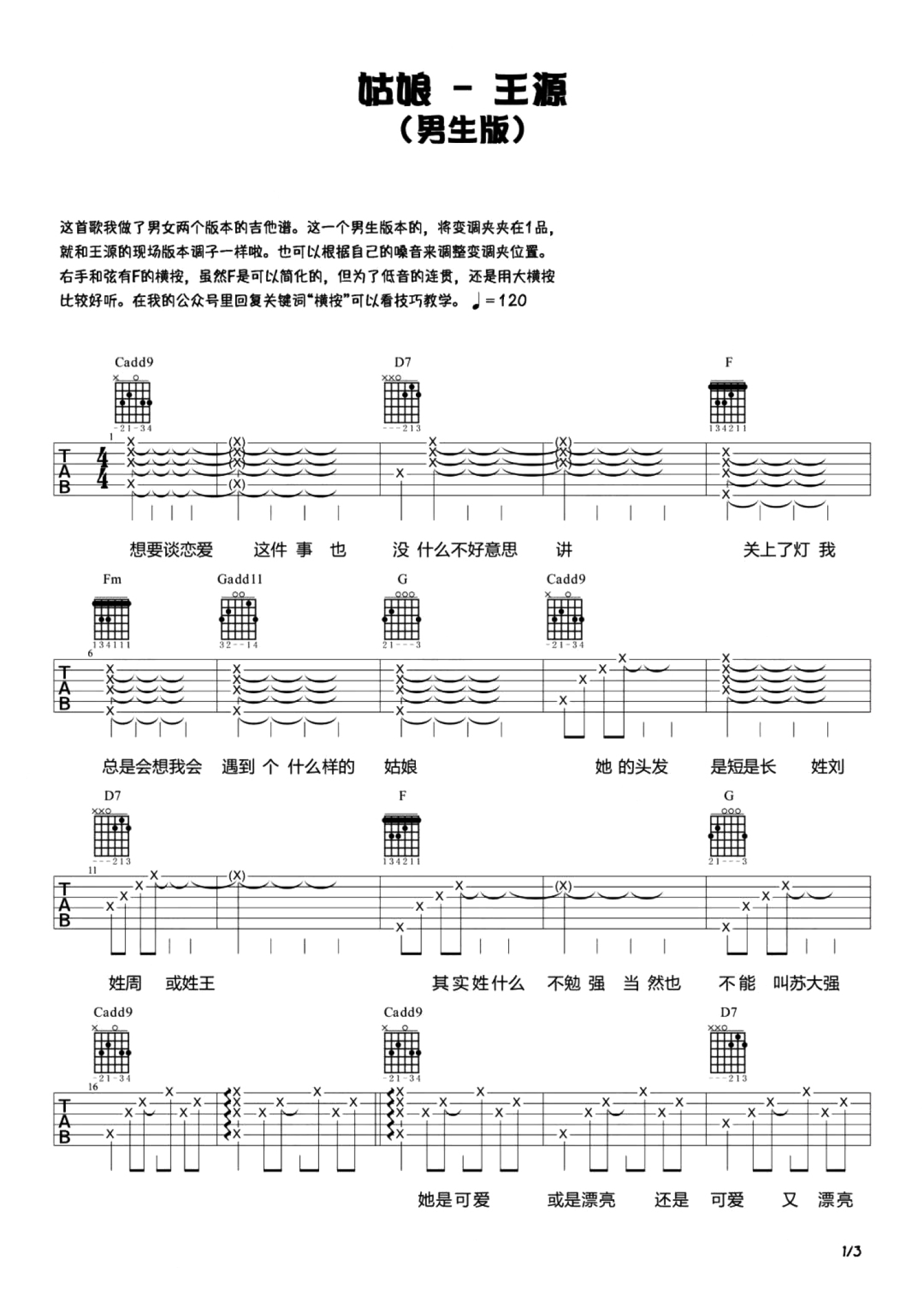 曲谱介绍: 王源(男生版)《姑娘》吉他谱_C调吉他弹唱谱_男生版