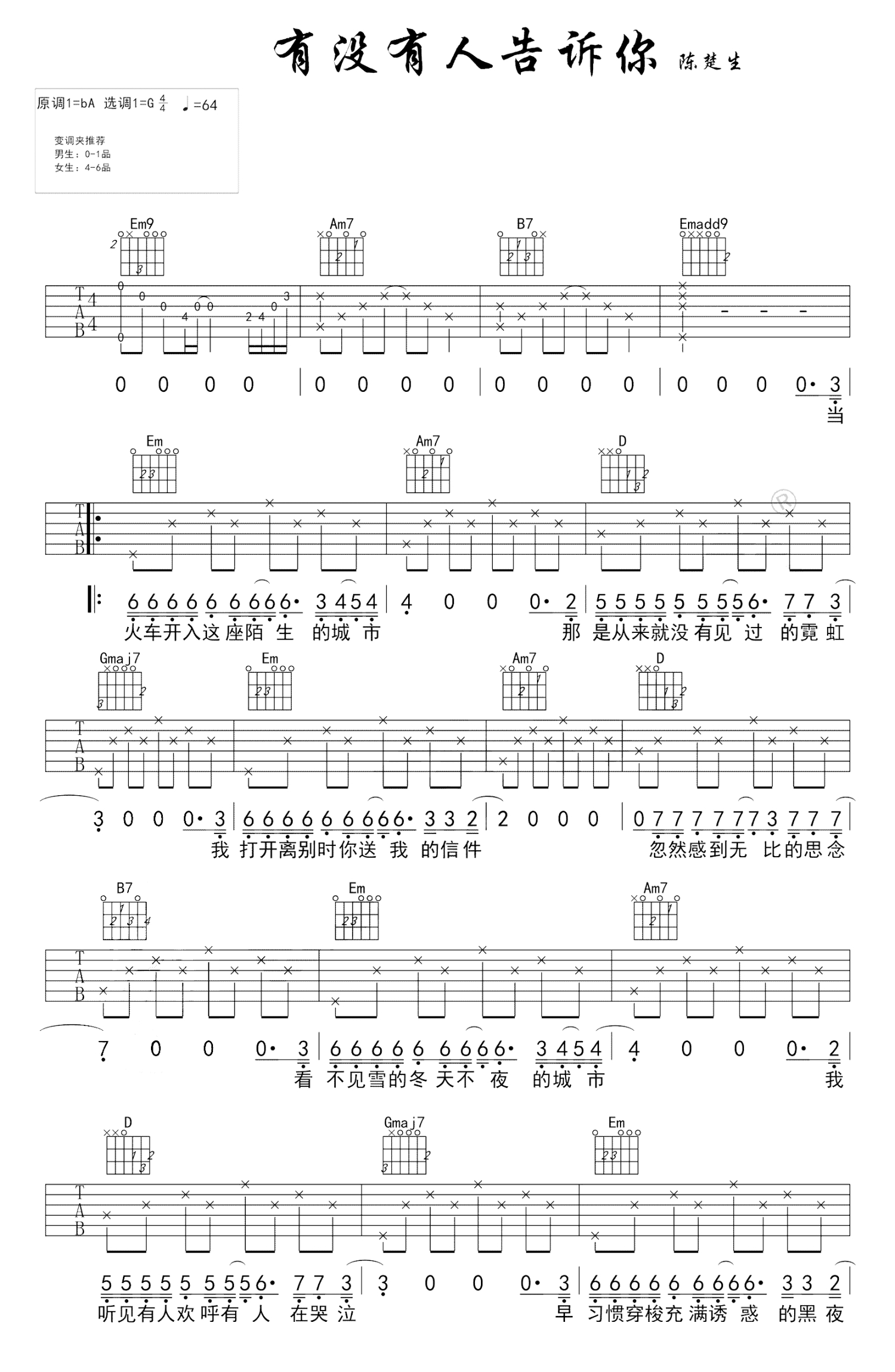 曲谱介绍: 陈楚生《有没有人告诉你》吉他谱_G调吉他弹唱谱
