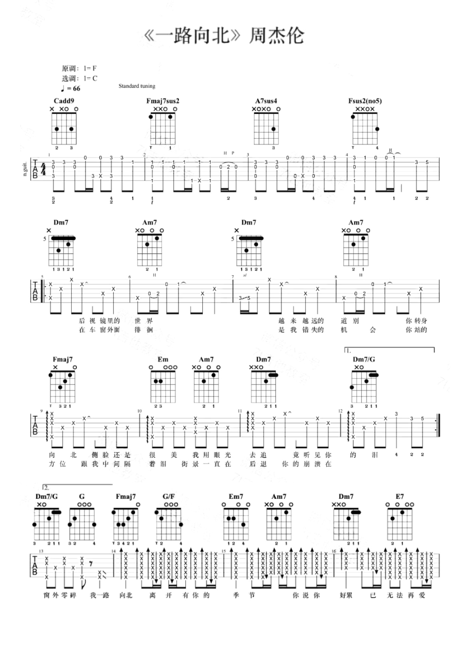 曲谱介绍: 周杰伦《一路向北》吉他谱_C调吉他弹唱谱