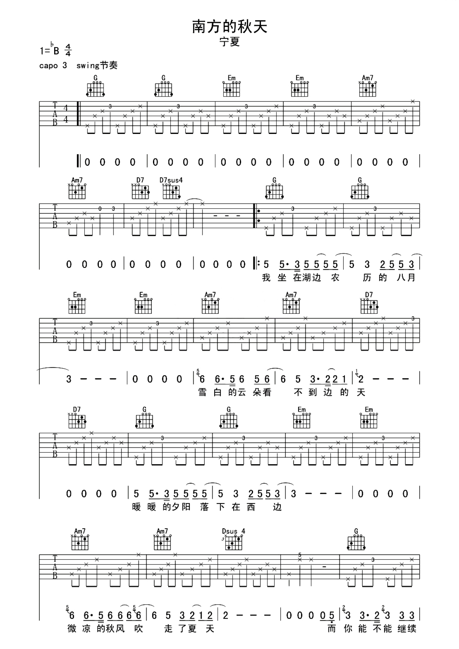 曲谱介绍: 宁夏《南方的秋天》吉他谱_C调吉他弹唱谱