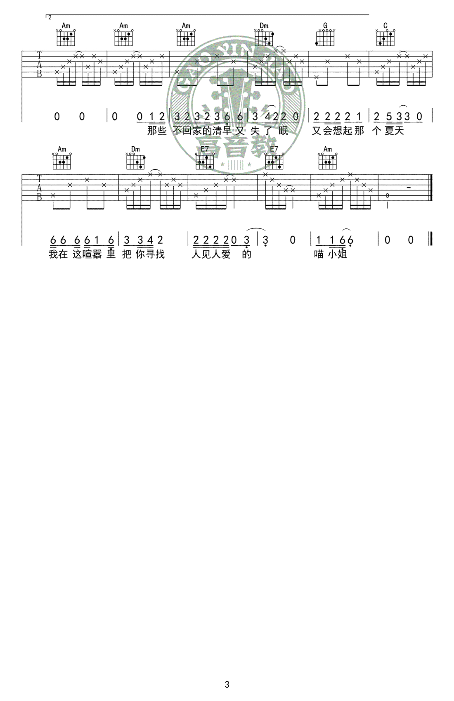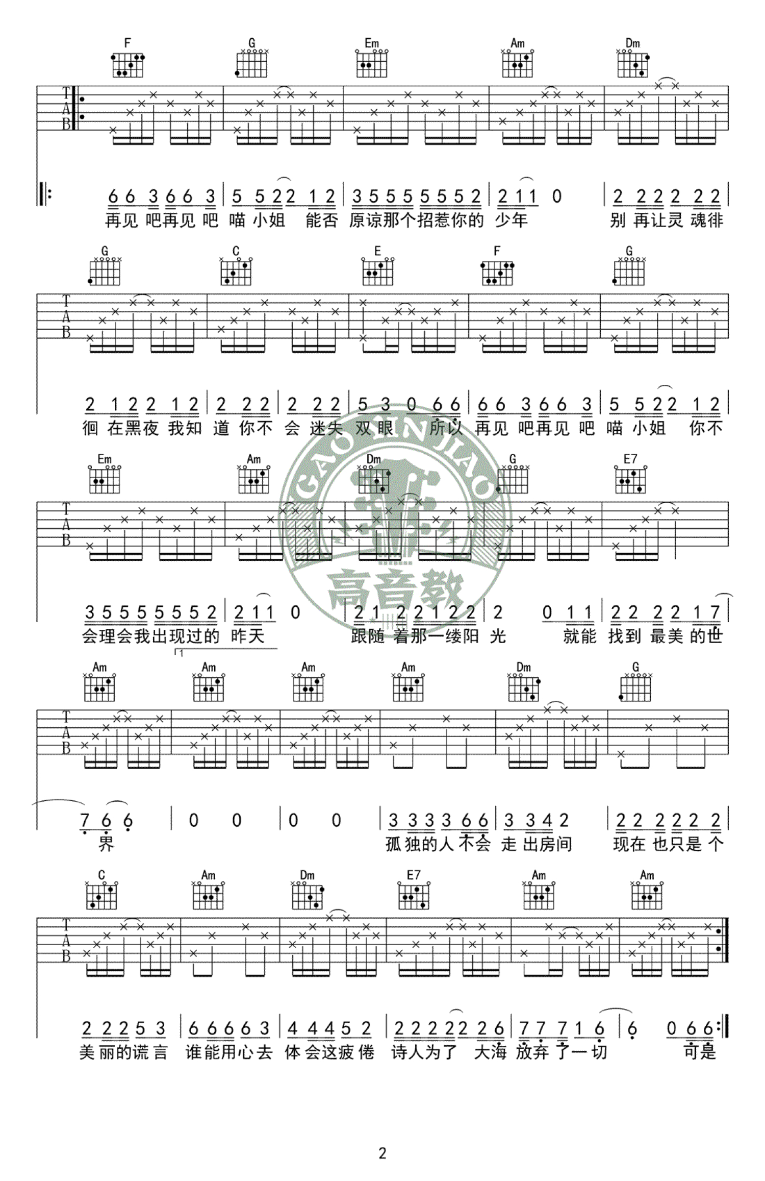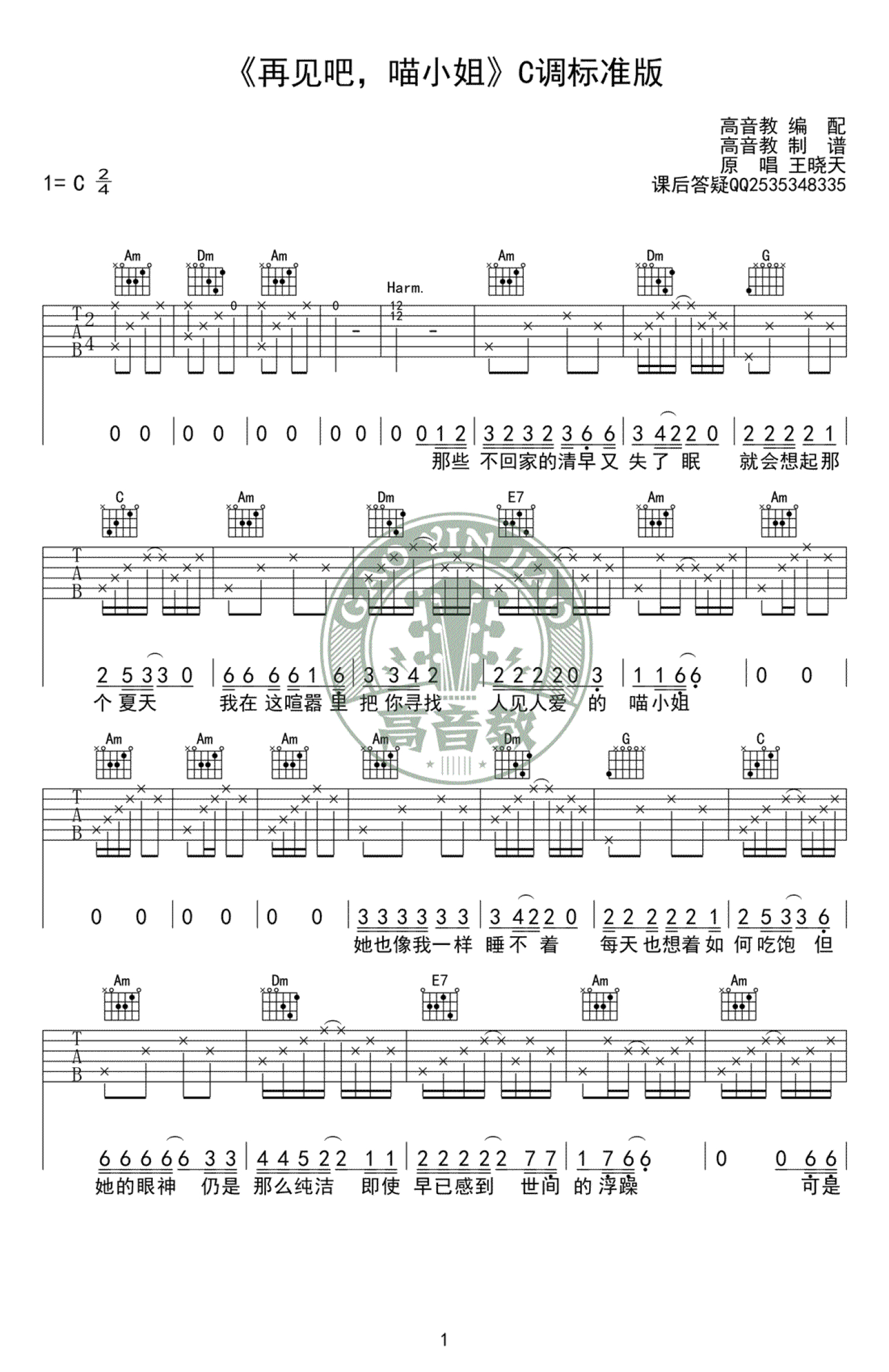 曲谱介绍: 王晓天《再见吧喵小姐》吉他谱,C调标准版。《中国好歌曲》优秀原创民谣歌曲。整首歌曲比较简单,没有大的难点,掌握好两段右手分解节奏型基本上就能够完成了学习了