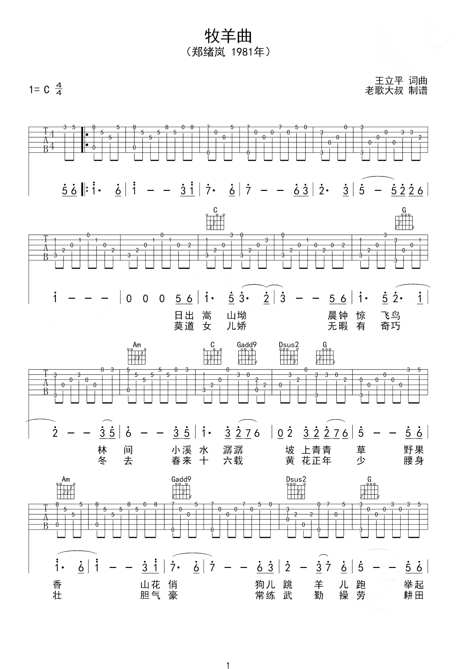 曲谱介绍: 郑绪岚《牧羊曲》吉他谱_C调吉他独奏谱