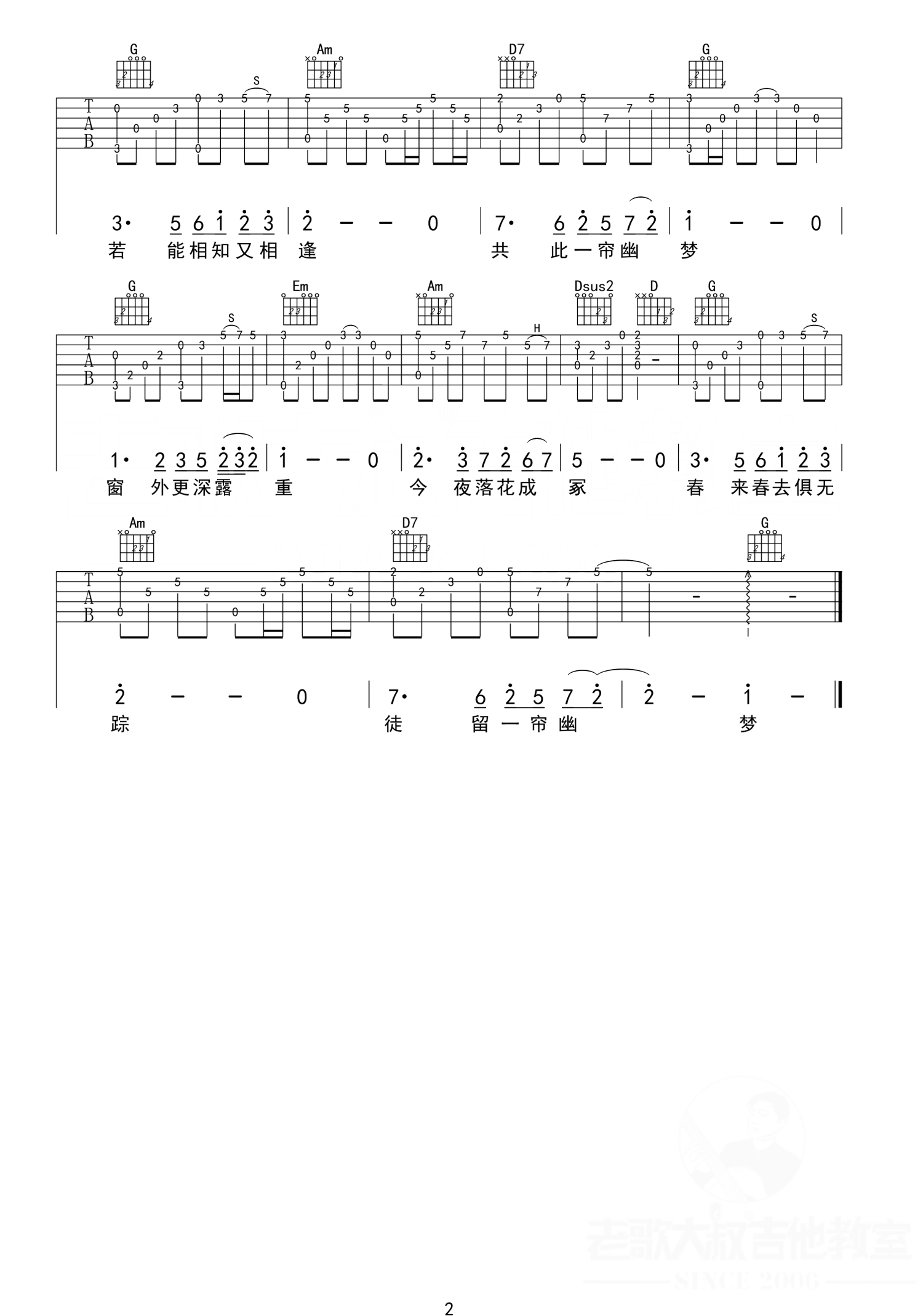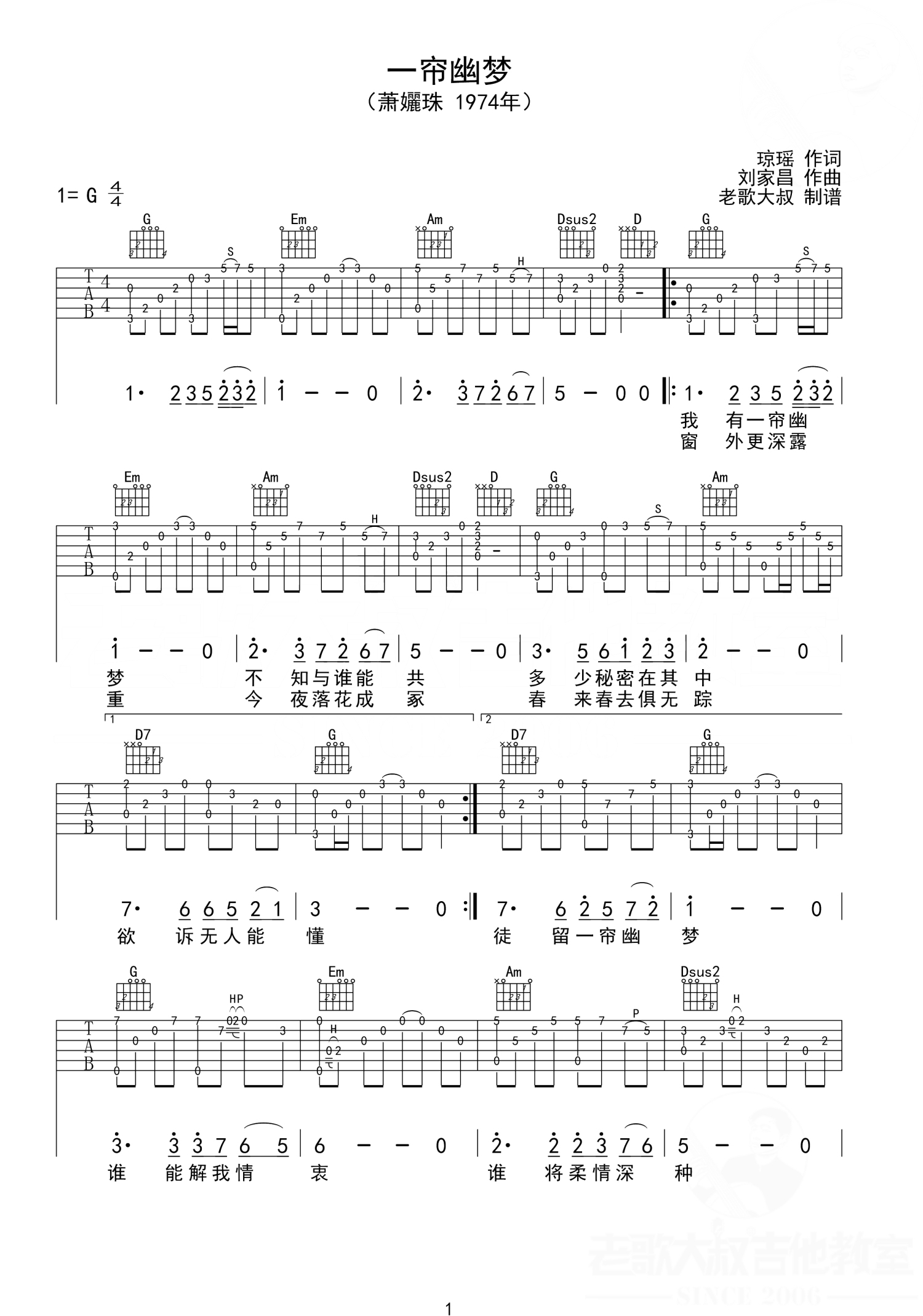曲谱介绍: 萧丽珠《一帘幽梦》吉他谱_C调吉他独奏谱