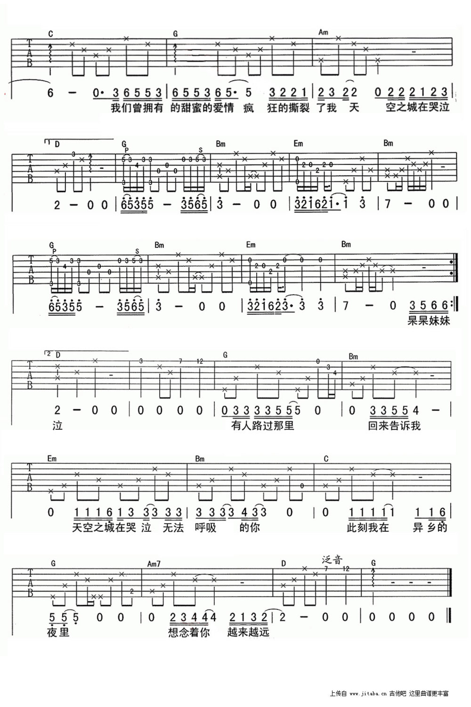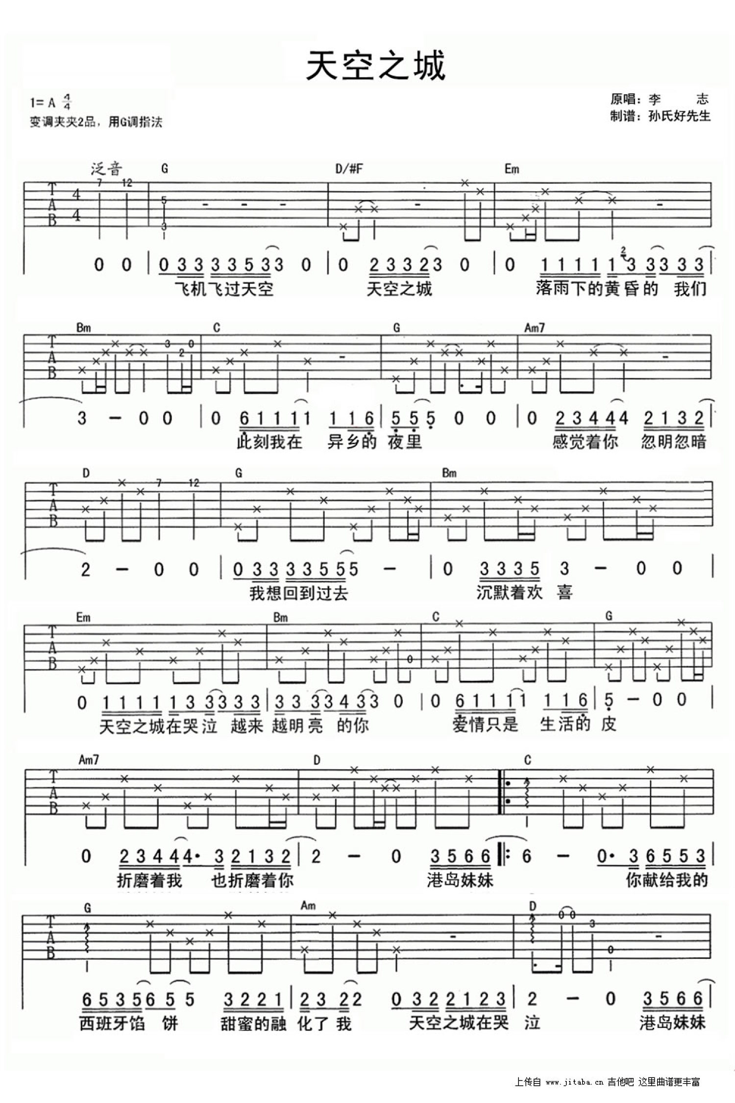 曲谱介绍: 天空之城吉他谱李志版本,原调A,变调夹夹第二品,用G调指法,修改完美版。《中国新歌声》学员蒋敦豪翻唱李志《天空之城》,让这首好听的民谣音乐作品,得到更多听众的认识和喜爱。虽然和逼哥的音色唱法不同,显然没李志潇洒随性,但是他唱出了自我,赋予了不同的情绪。