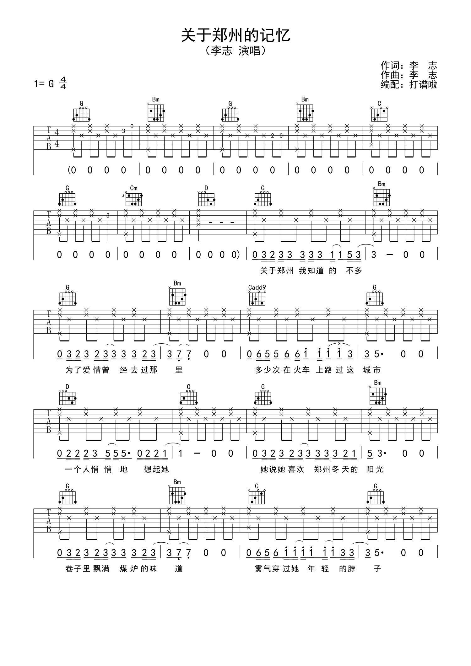 曲谱介绍: 李志《关于郑州的记忆》吉他谱_G调吉他弹唱谱