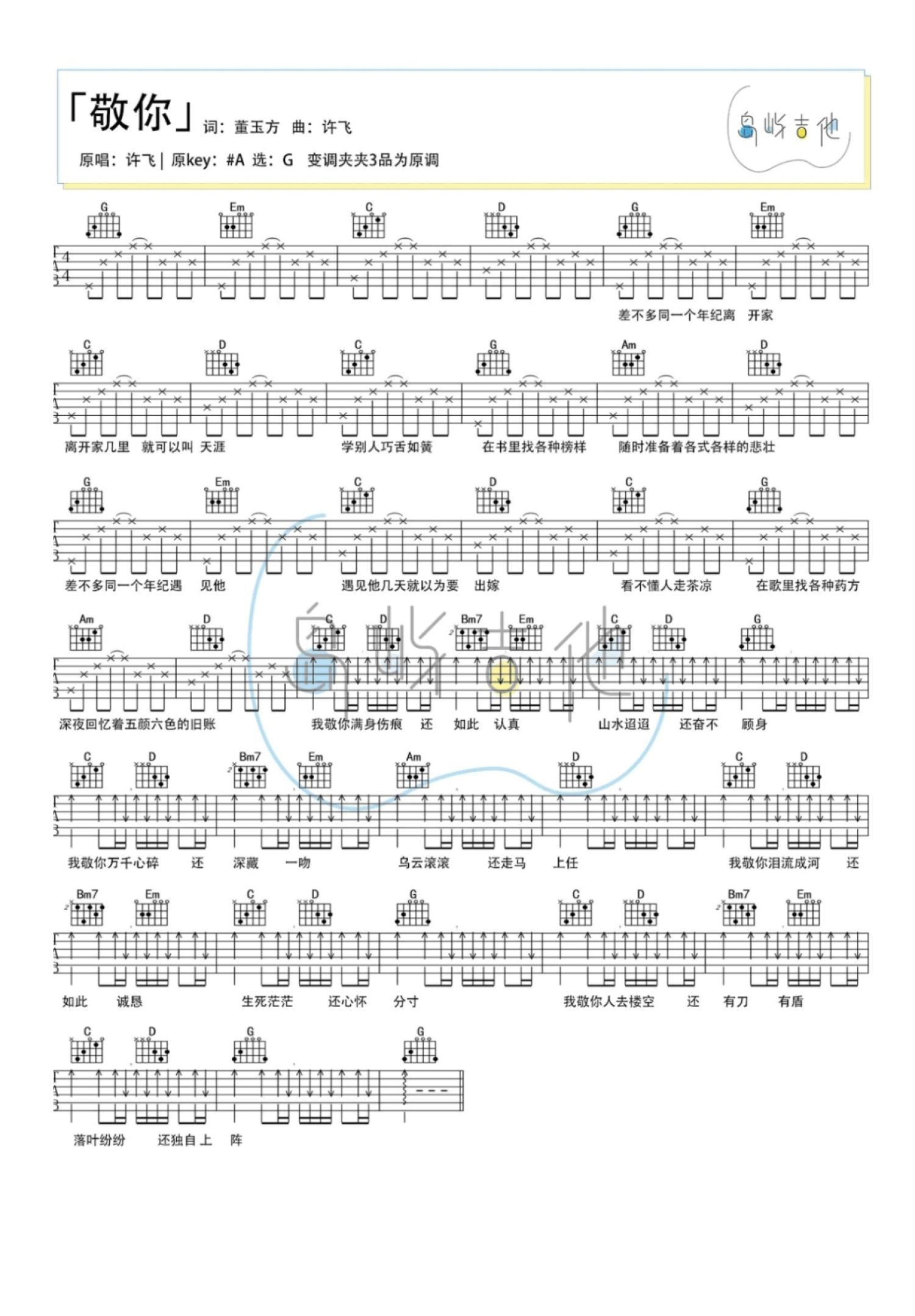 曲谱介绍: 许飞《敬你》吉他谱_G调吉他弹唱谱