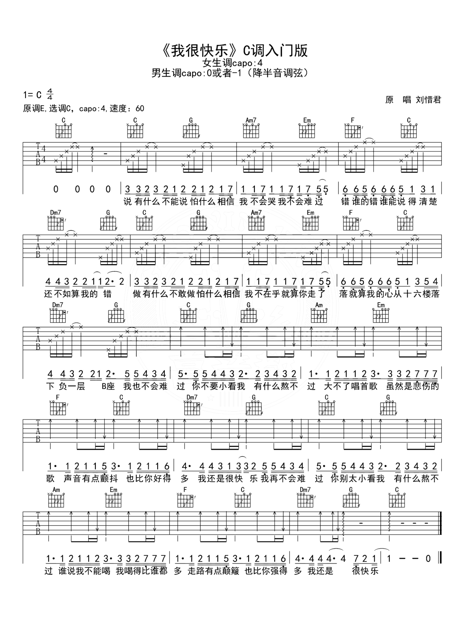 曲谱介绍: 抖音热歌《我很快乐》,刘惜君2010年度音乐先锋榜内地十大金曲之一,直白而不失新意的歌词,优美的旋律,唱出的却是看似柔弱内心女孩的坚强一面,没有刻意着力,不求华丽,但直入人心。面对争议,坦然地承受,面对离开,微笑摇头,面对挫折,即便难过也要快乐,这就是《我很快乐》 。 C调编配高清入门版六线谱,弹唱变调夹夹第四品,速度每分钟60拍