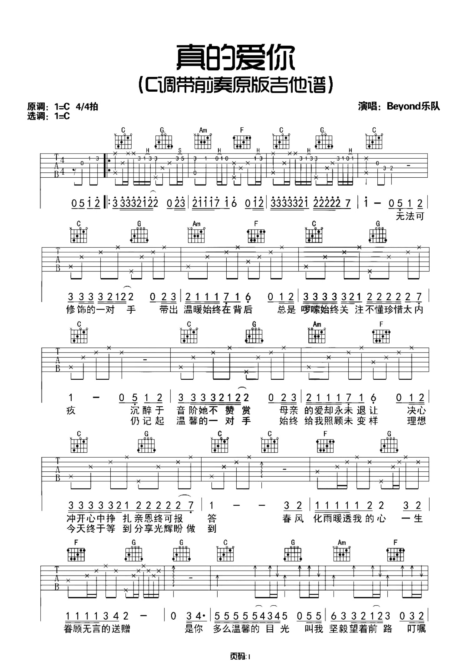 真的爱你吉他谱 - Beyond - C调吉他弹唱谱 - 带前奏原版