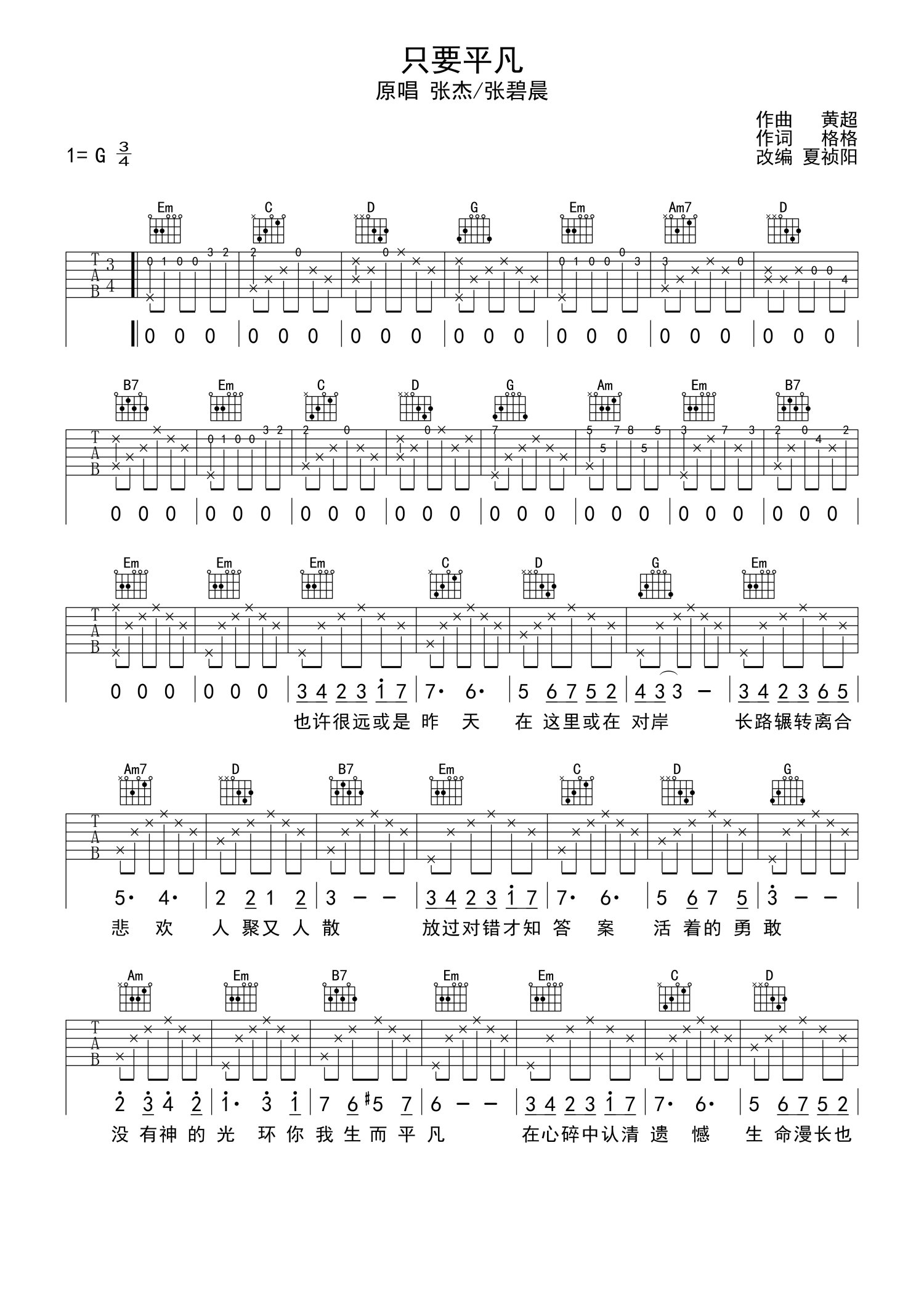 • 只要平凡吉他谱 - 张杰/张碧晨 - G调吉他弹唱谱第1张