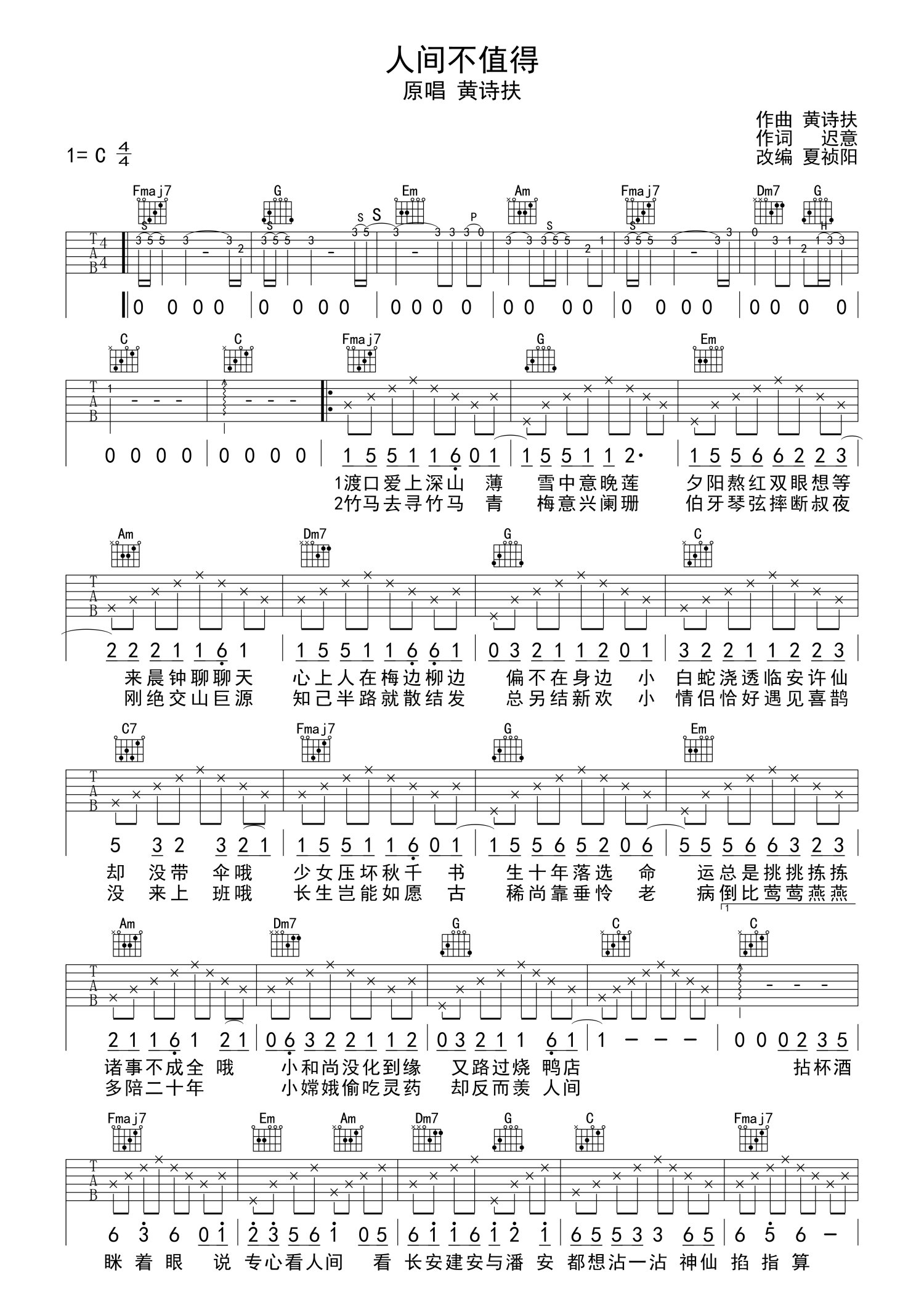 曲谱介绍: 黄诗扶《人间不值得》吉他谱_C调吉他弹唱谱