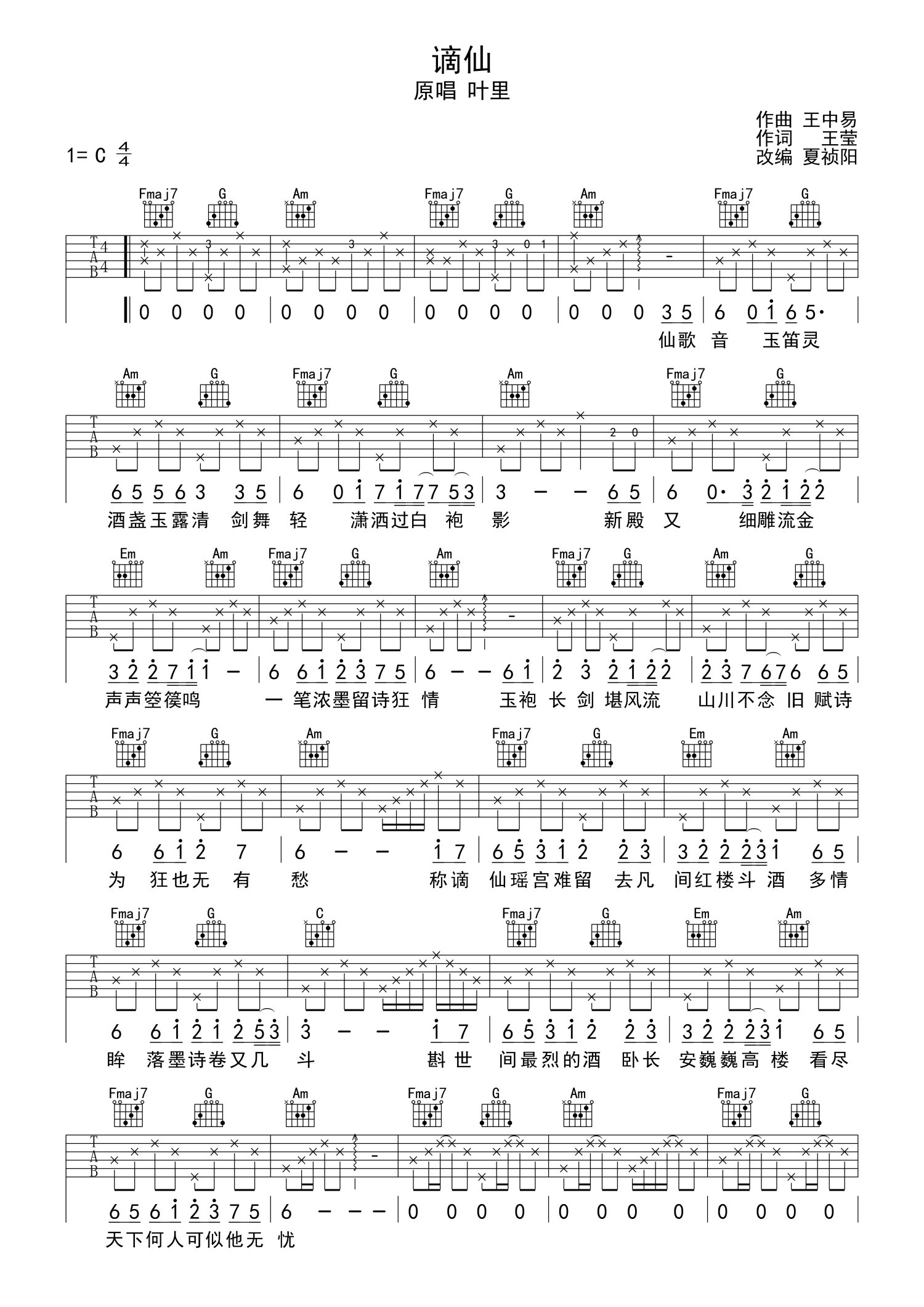 曲谱介绍: 叶里《谪仙》吉他谱_C调吉他弹唱谱