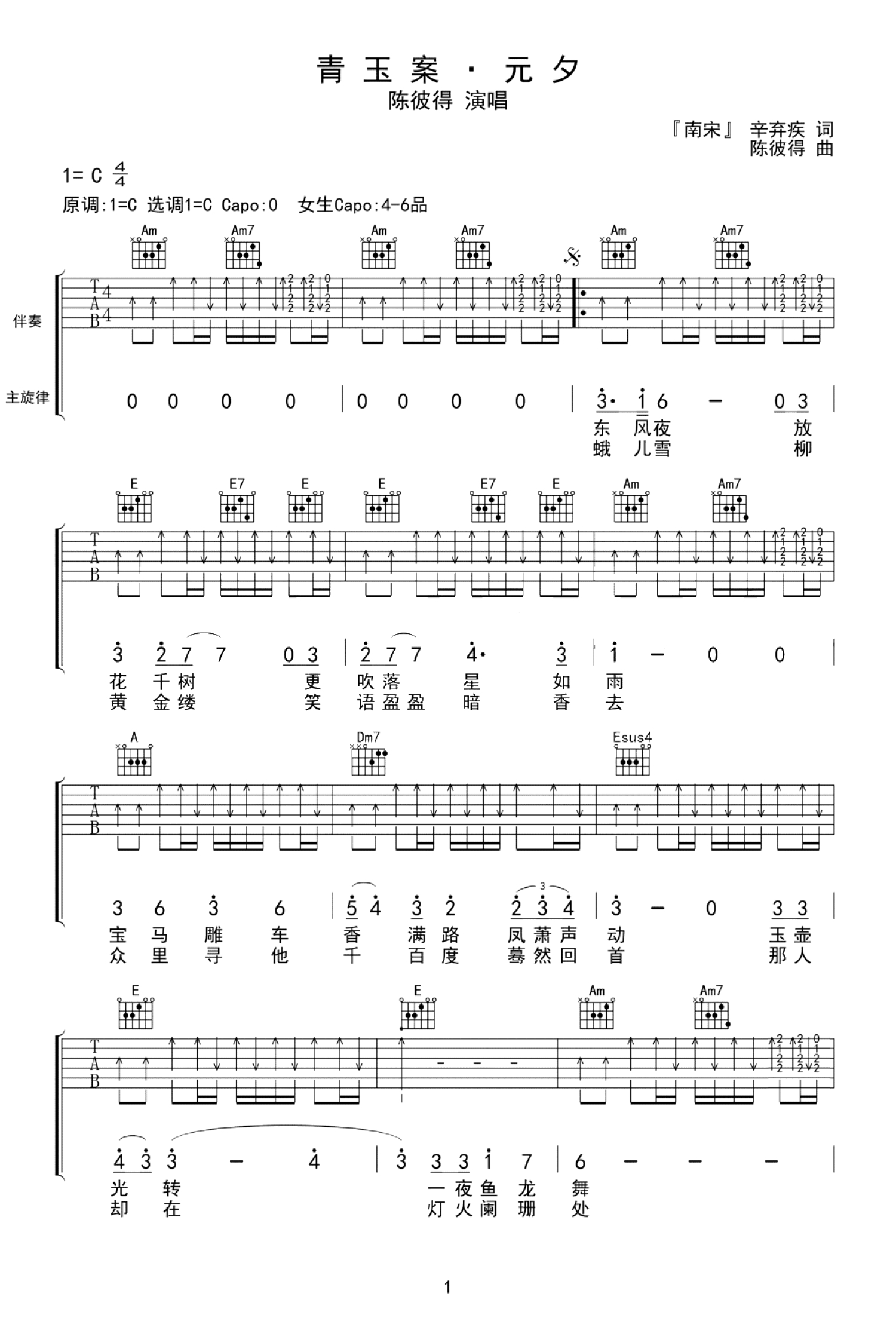 青玉案元夕吉他谱 - 陈彼得 - C调吉他弹唱谱