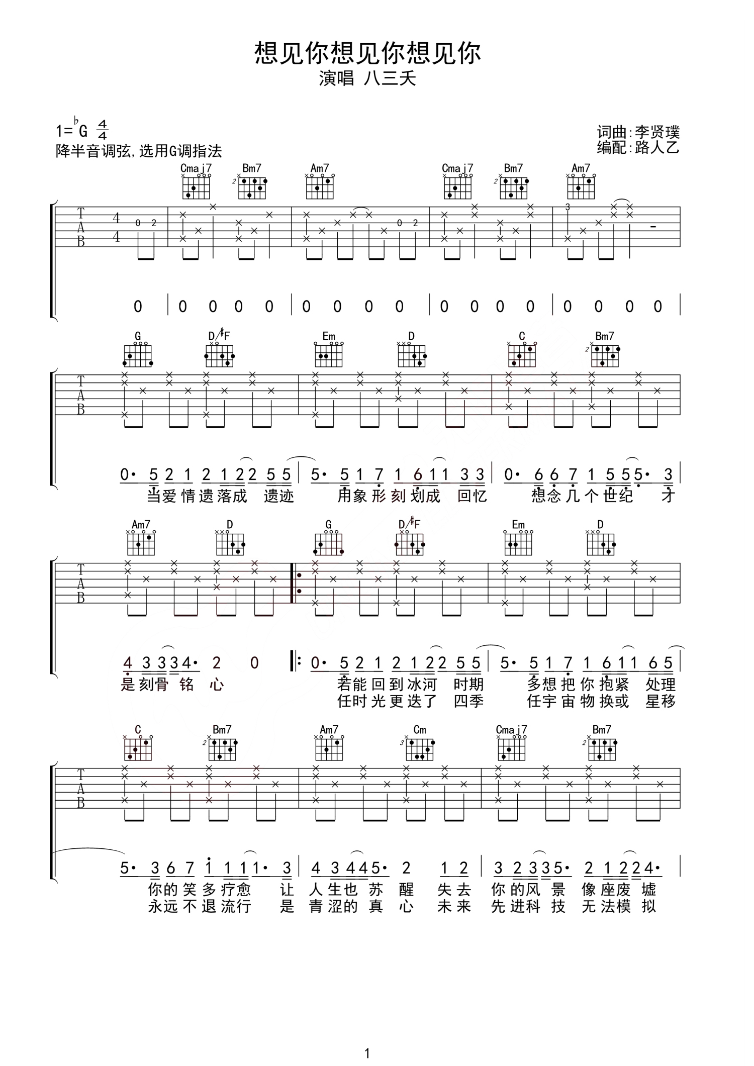 想见你想见你想见你吉他谱 - 八三夭 - G调吉他弹唱谱