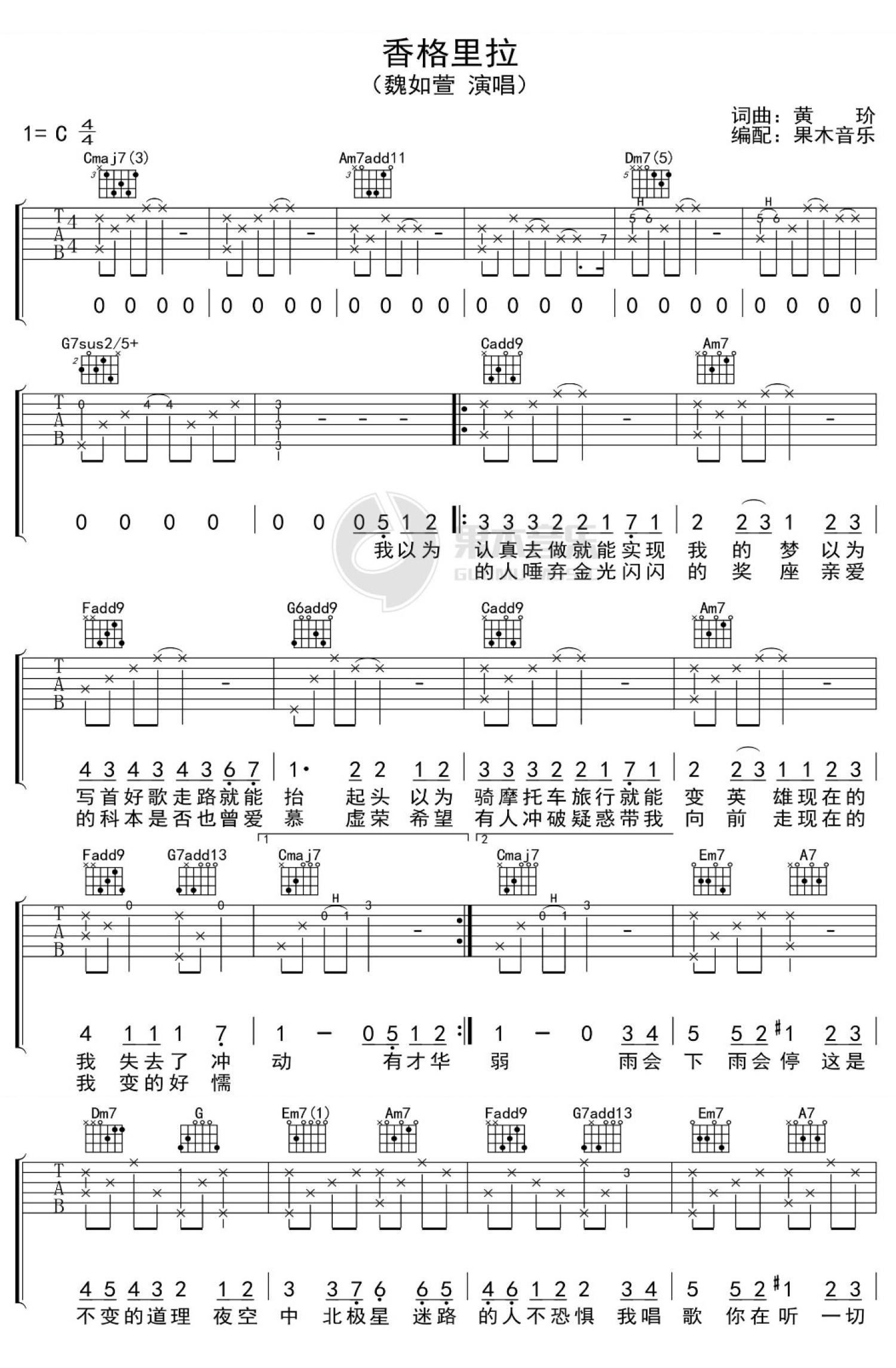 曲谱介绍: 魏如萱《香格里拉》吉他谱_C调吉他弹唱谱