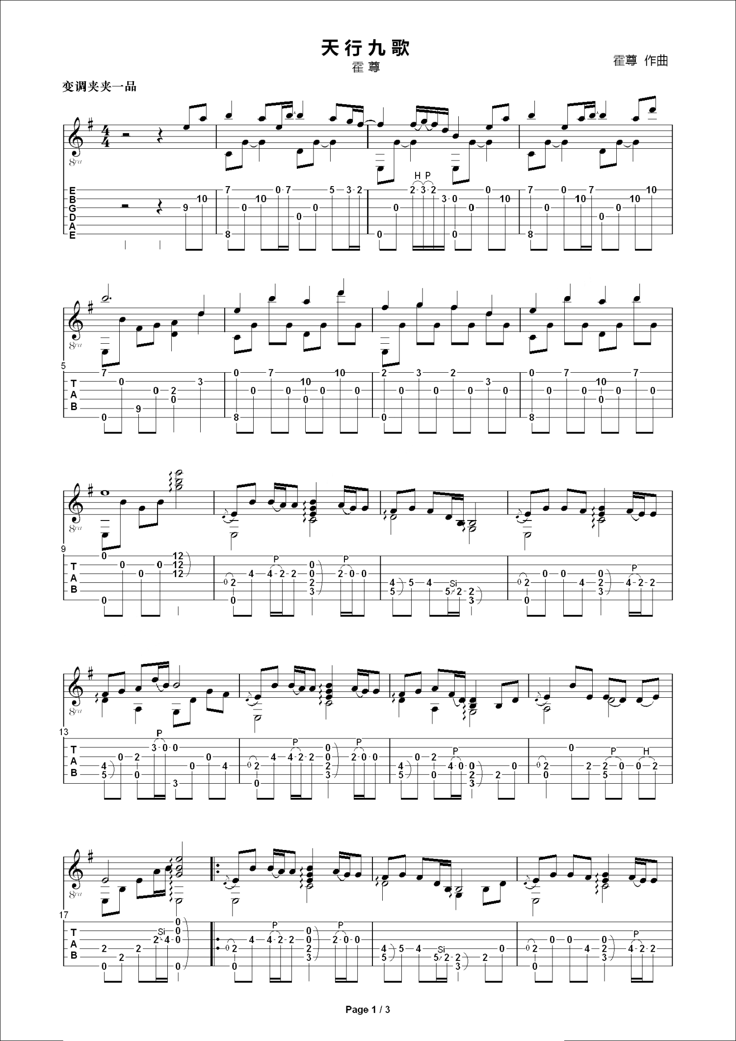 曲谱介绍: 霍尊《天行九歌》吉他谱_G调吉他独奏谱