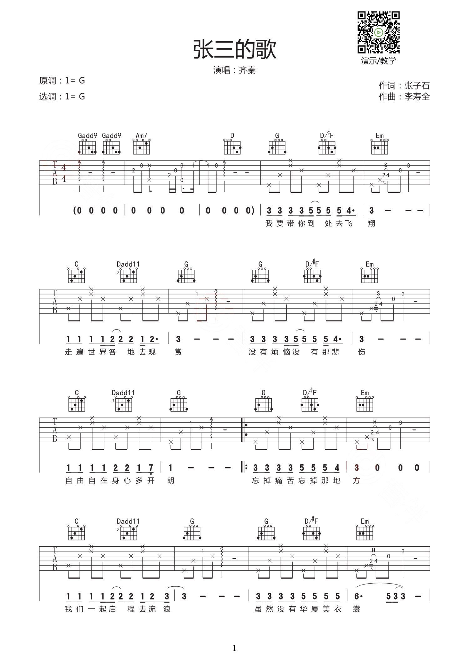 曲谱介绍: 齐秦《张三的歌》吉他谱_G调吉他弹唱谱