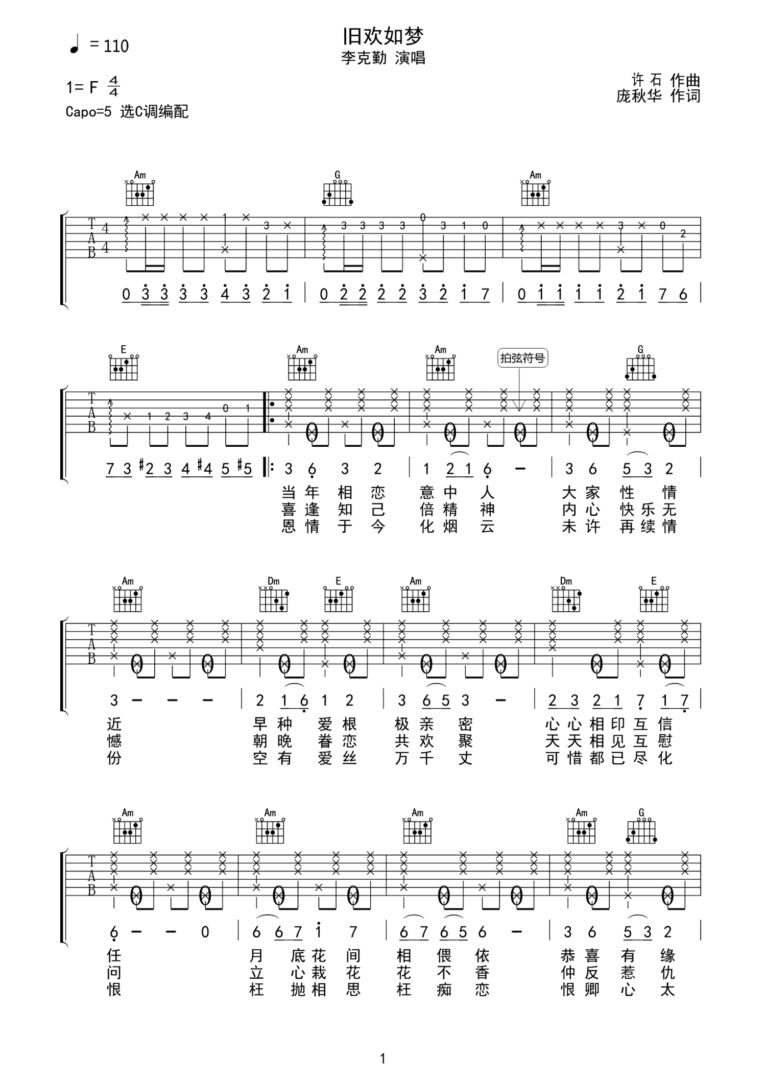 曲谱介绍: 李克勤《旧欢如梦》吉他谱_C调吉他弹唱谱