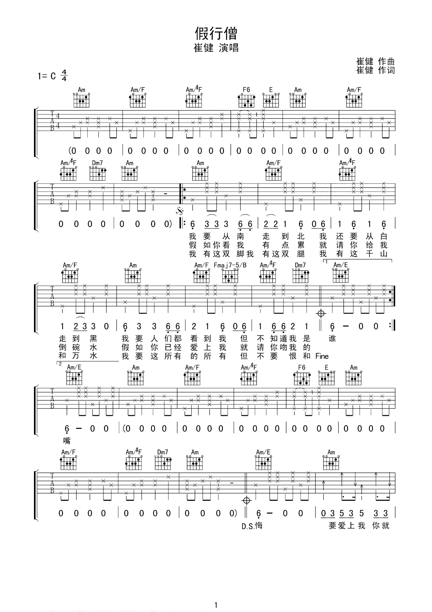 曲谱介绍: 崔健《假行僧》吉他谱_C调吉他弹唱谱