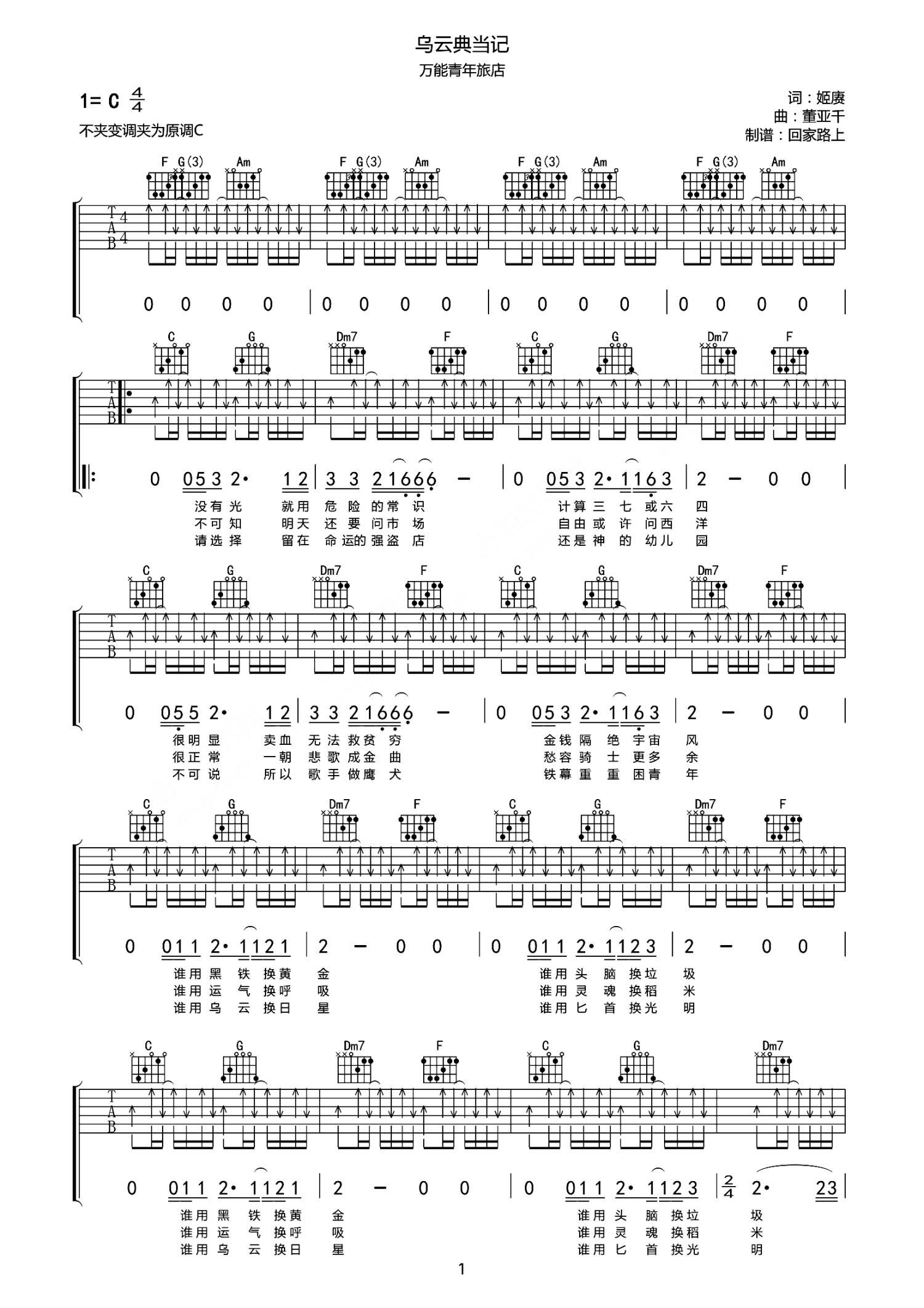曲谱介绍: 万能青年旅店《乌云典当记》吉他谱_C调吉他弹唱谱