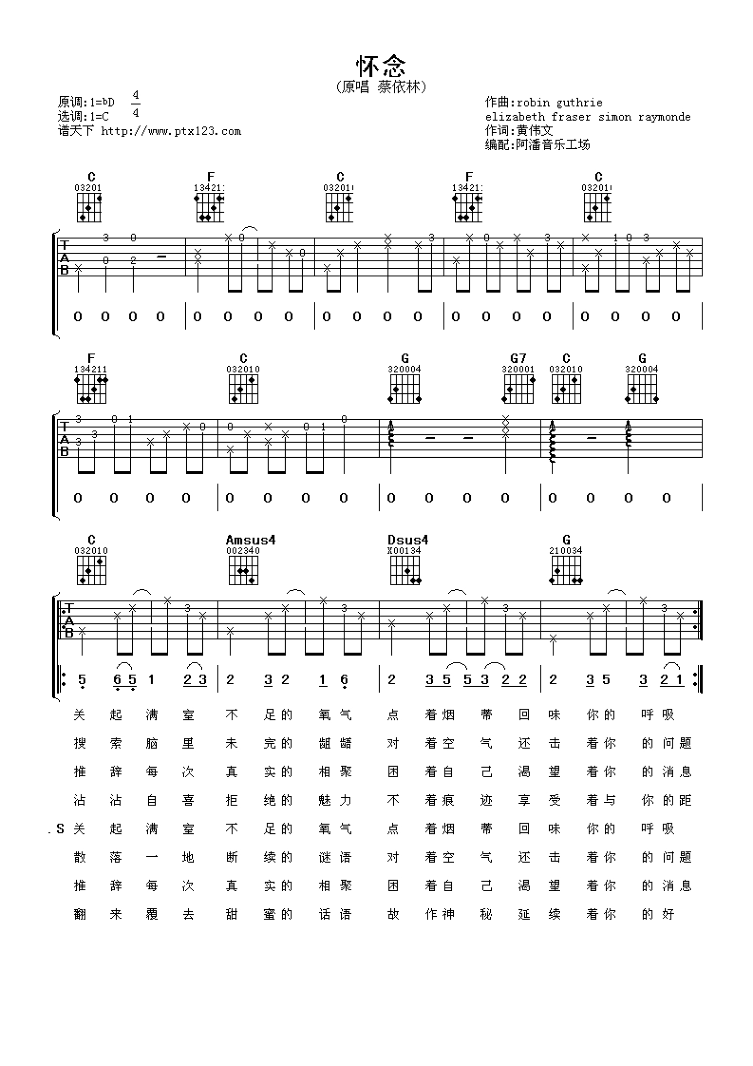 曲谱介绍: 蔡依林《怀念》吉他谱_C调吉他弹唱谱