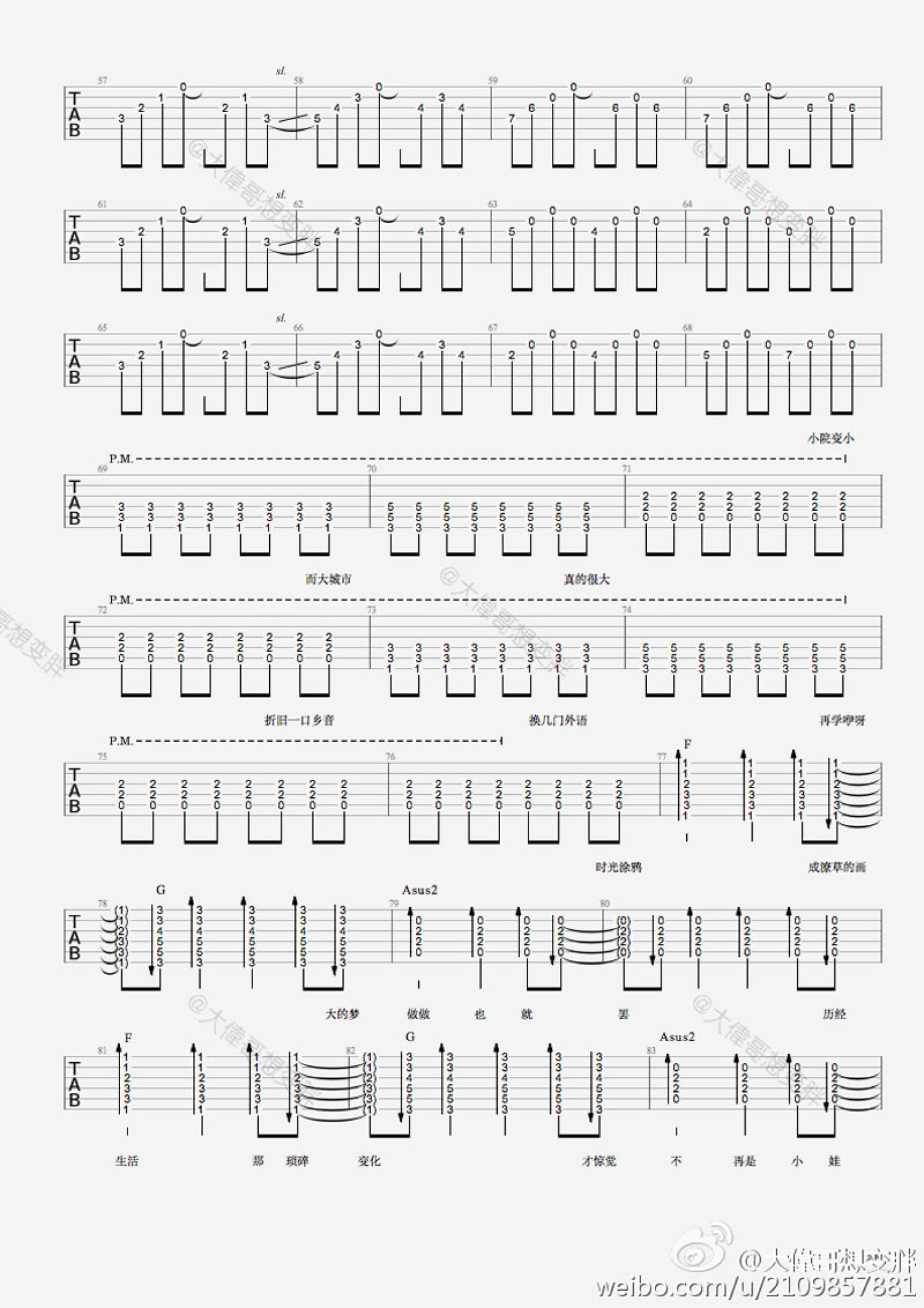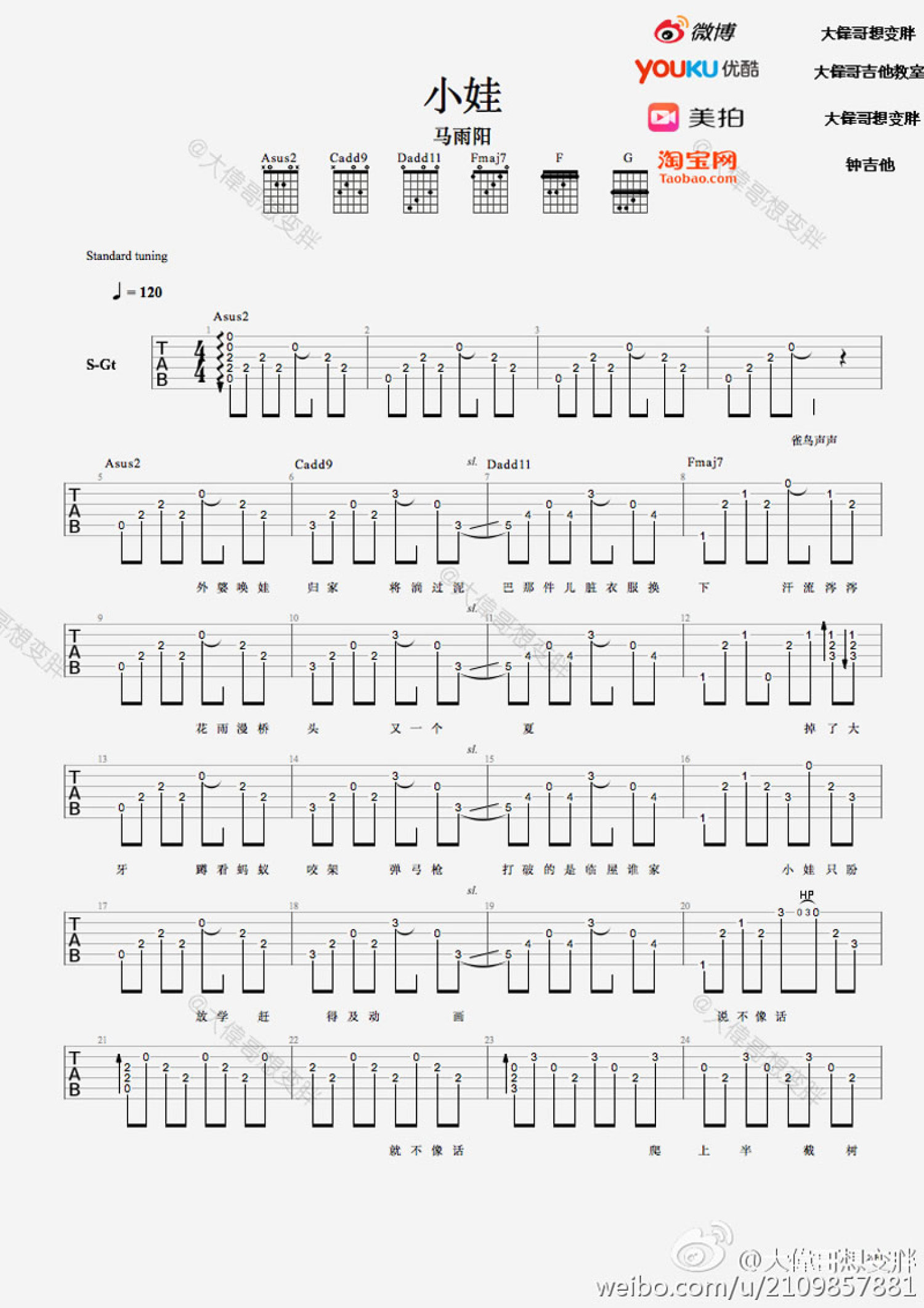 曲谱介绍: 马雨阳小娃吉他谱,民谣合辑《民谣地图·拾众而歌》单曲,小娃吉他谱,弹唱图片谱完整版,唐映枫的歌词像诗又像画,带我们回忆童年记忆中的点点滴。因为这个是多把吉他弹的,所以整合了一下,中间solo部分省略了,这个还挺好听的。