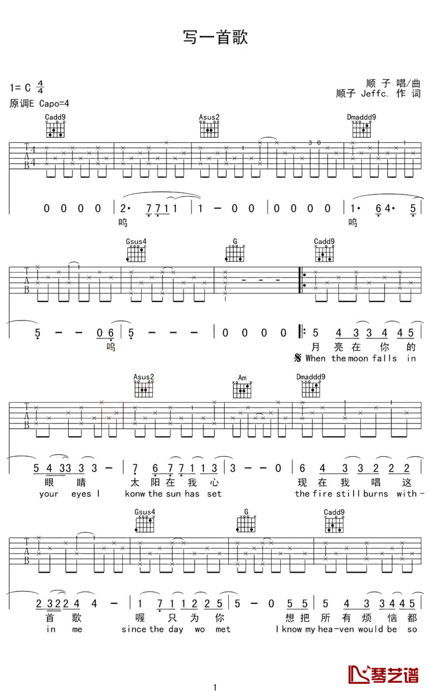 曲谱介绍: 顺子《写一首歌》吉他谱_C调吉他弹唱谱