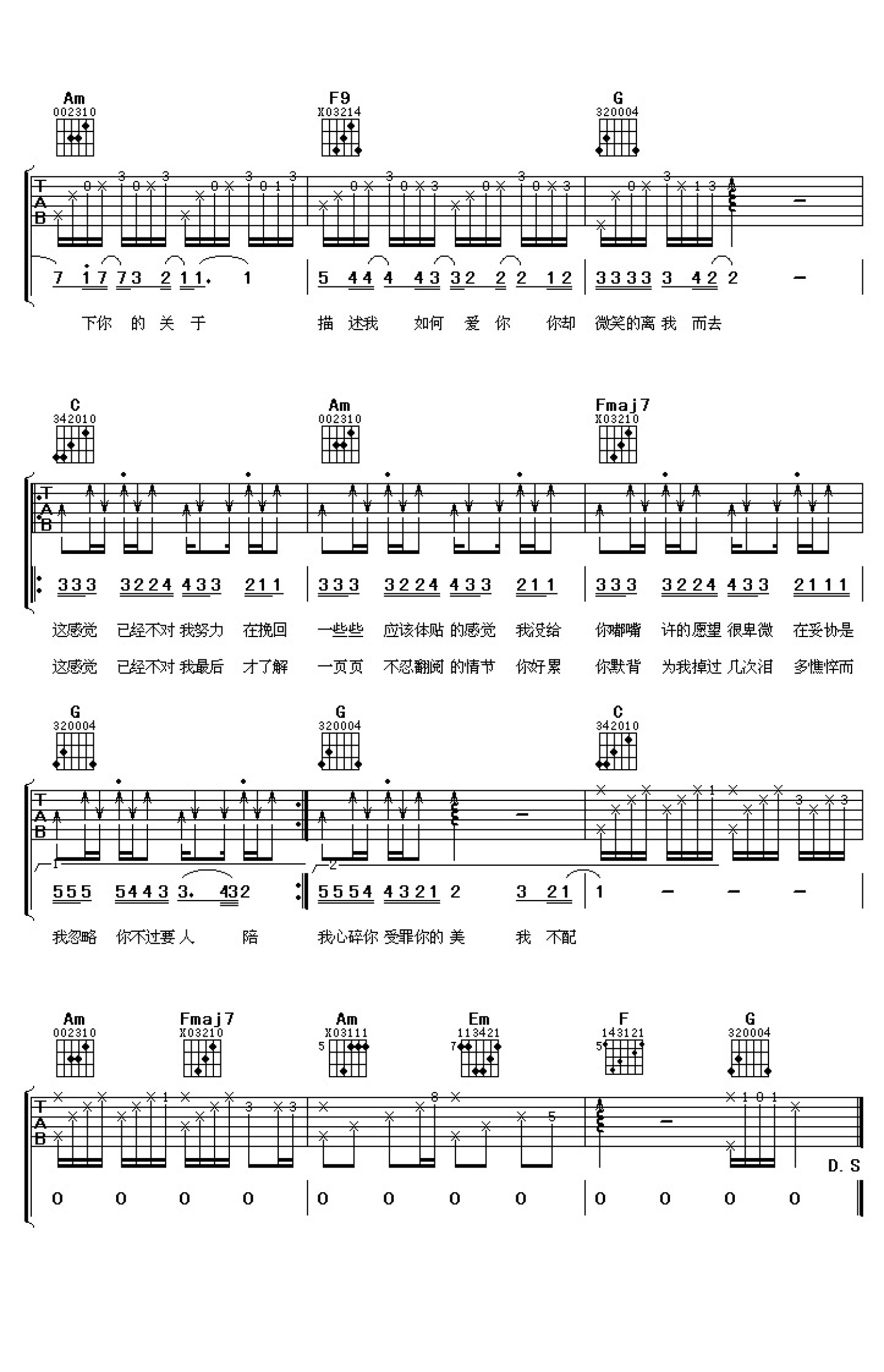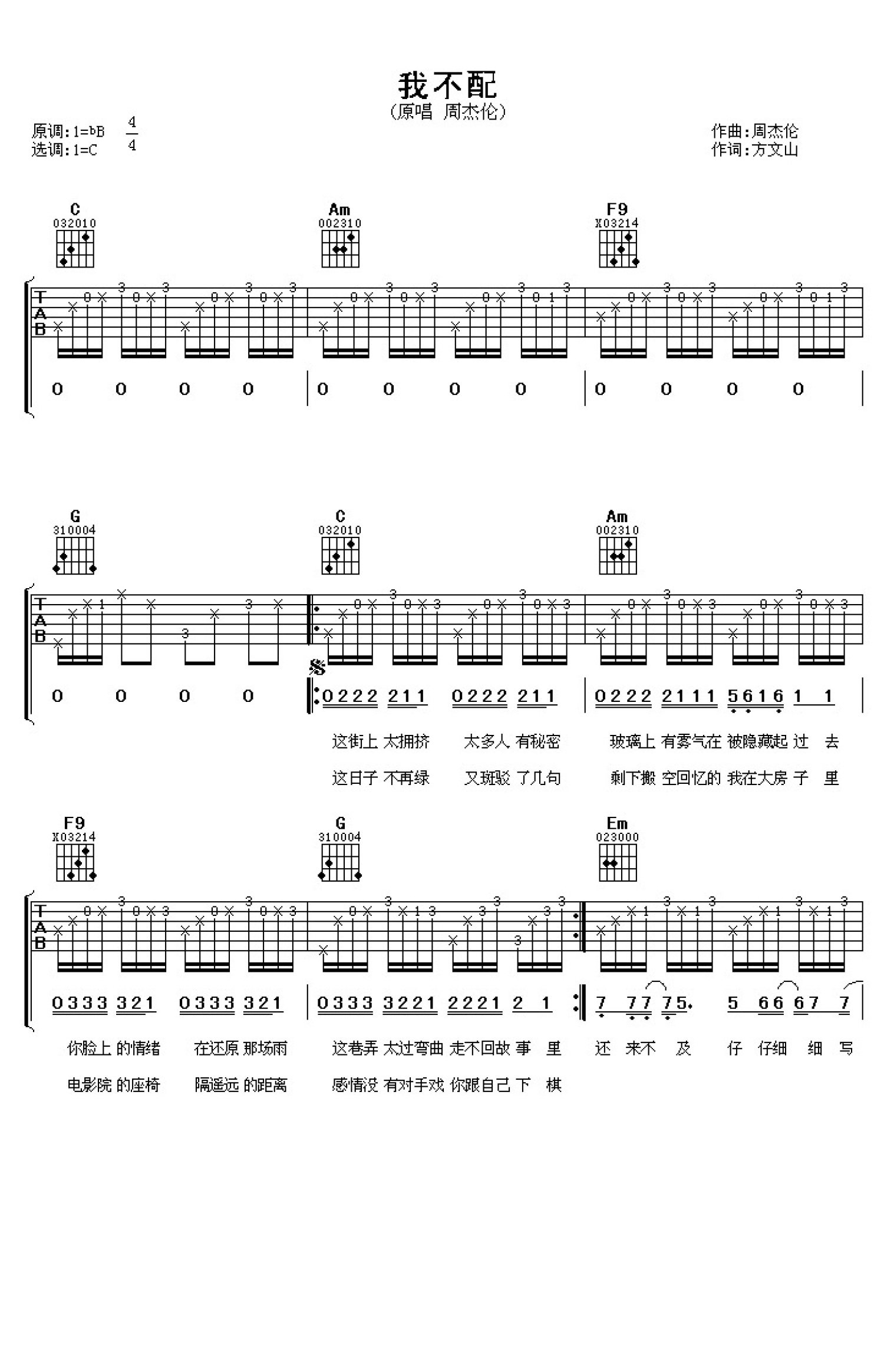 曲谱介绍: 周杰伦《我不配》吉他谱_C调吉他弹唱谱