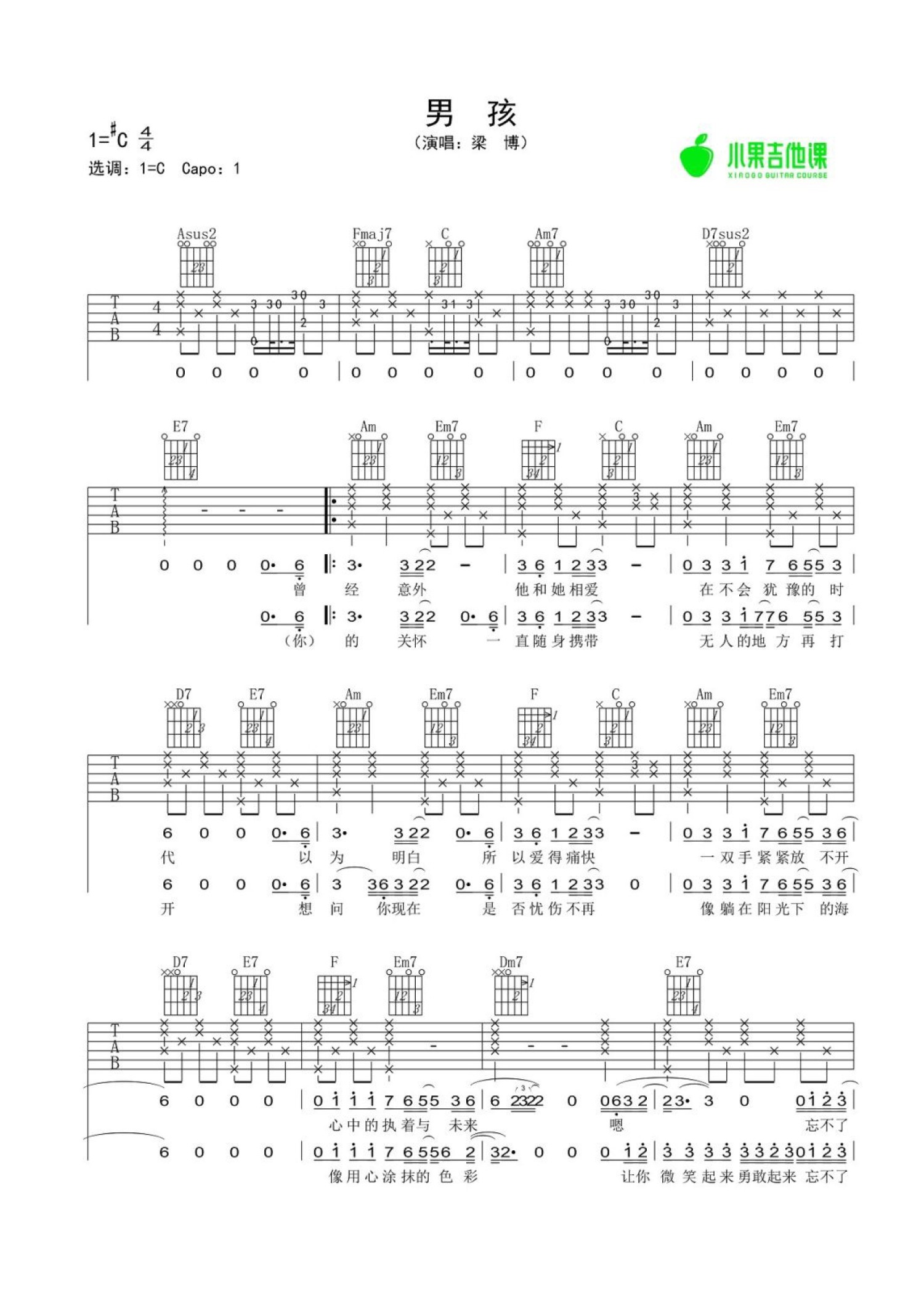 曲谱介绍: 梁博《男孩》吉他谱_C调吉他弹唱谱