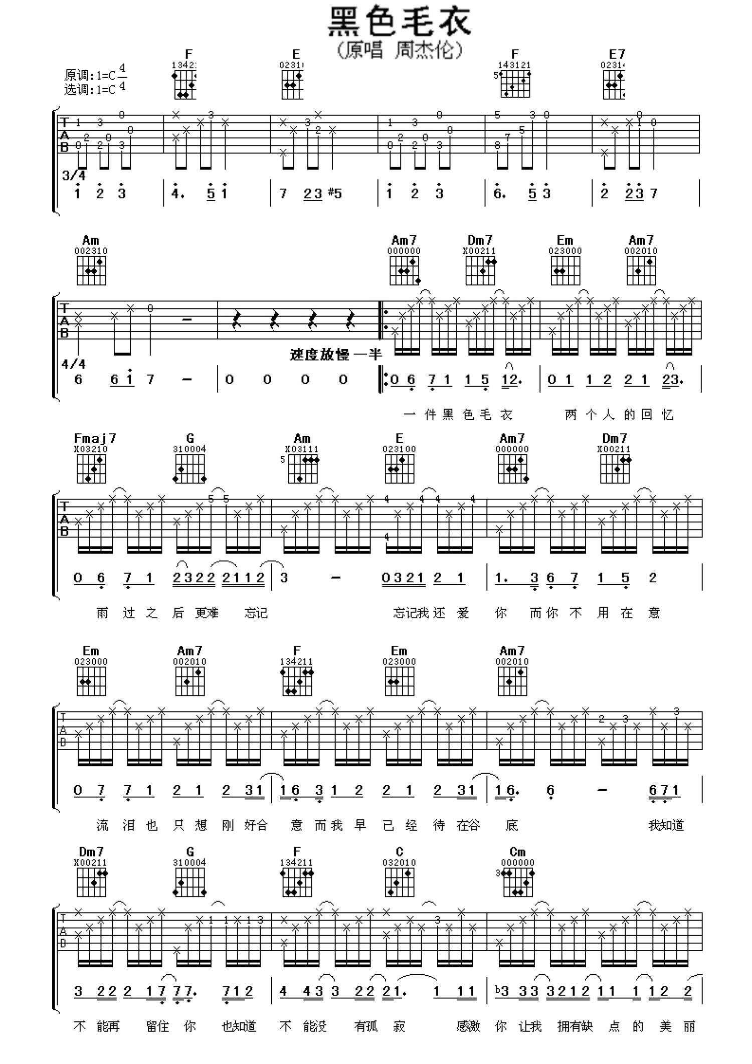 黑色毛衣吉他谱 - 周杰伦 - C调吉他弹唱谱