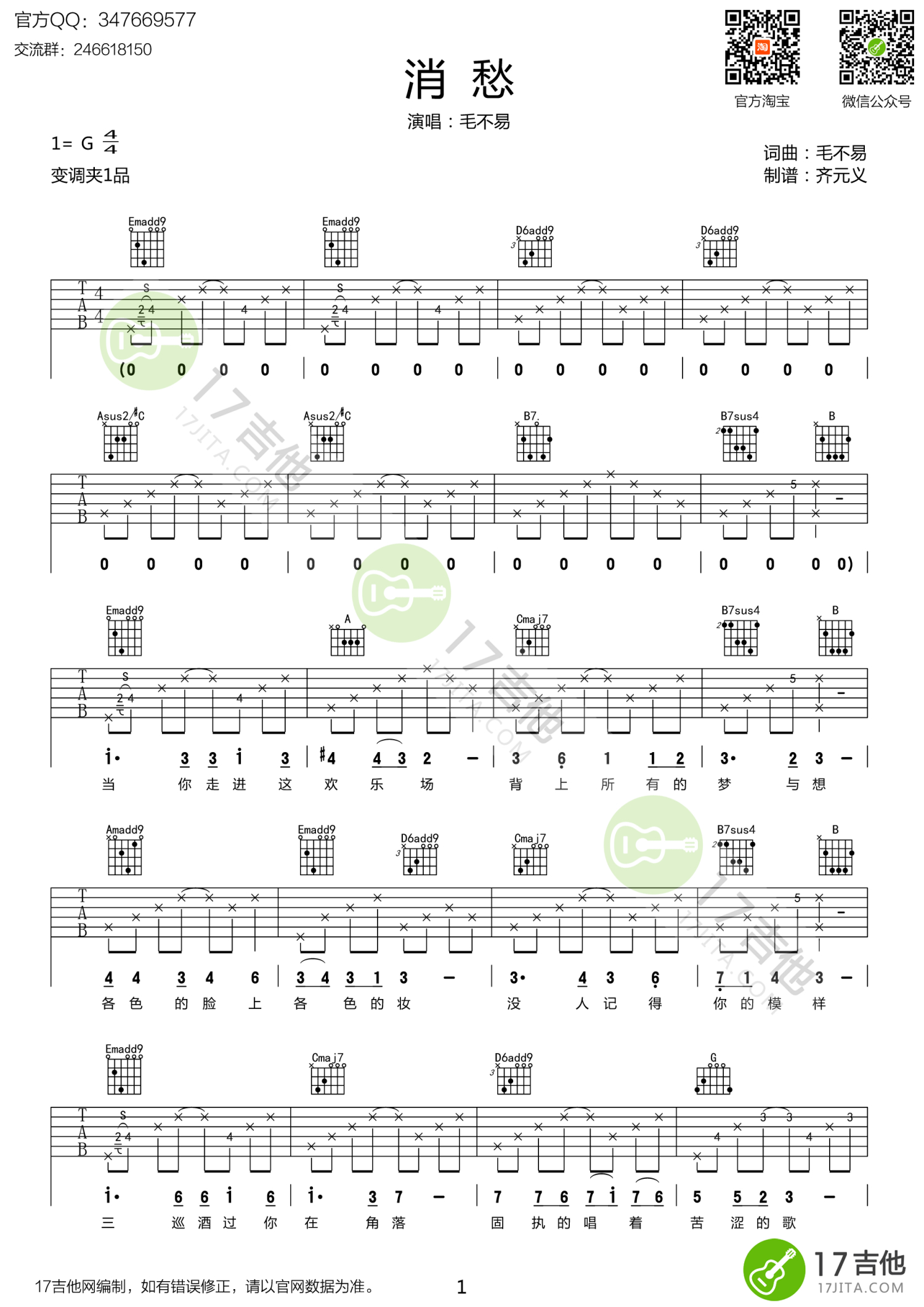 曲谱介绍: 毛不易《消愁》吉他谱_G调吉他弹唱谱