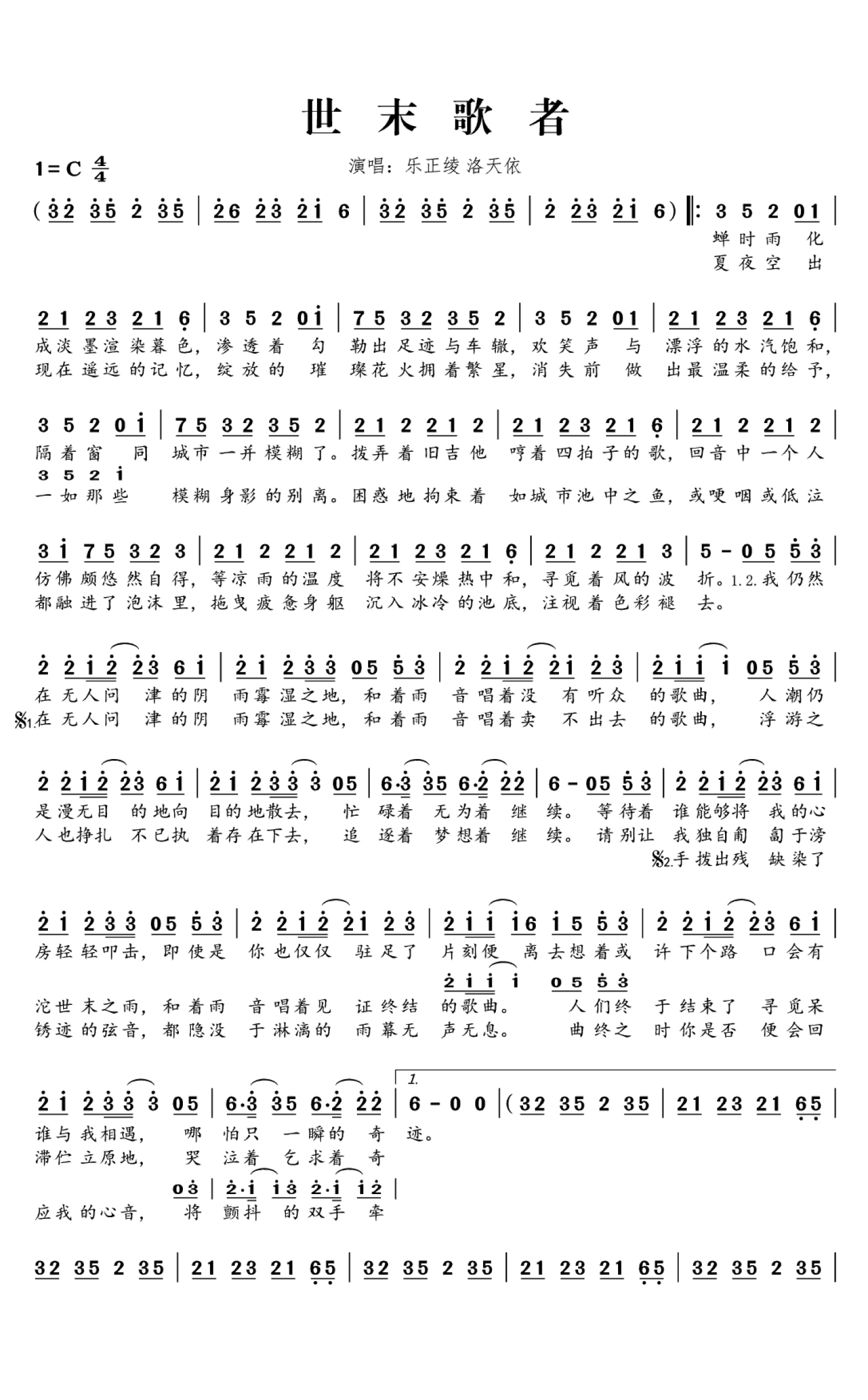 曲谱介绍: 洛天依《世末歌者》歌词_简谱