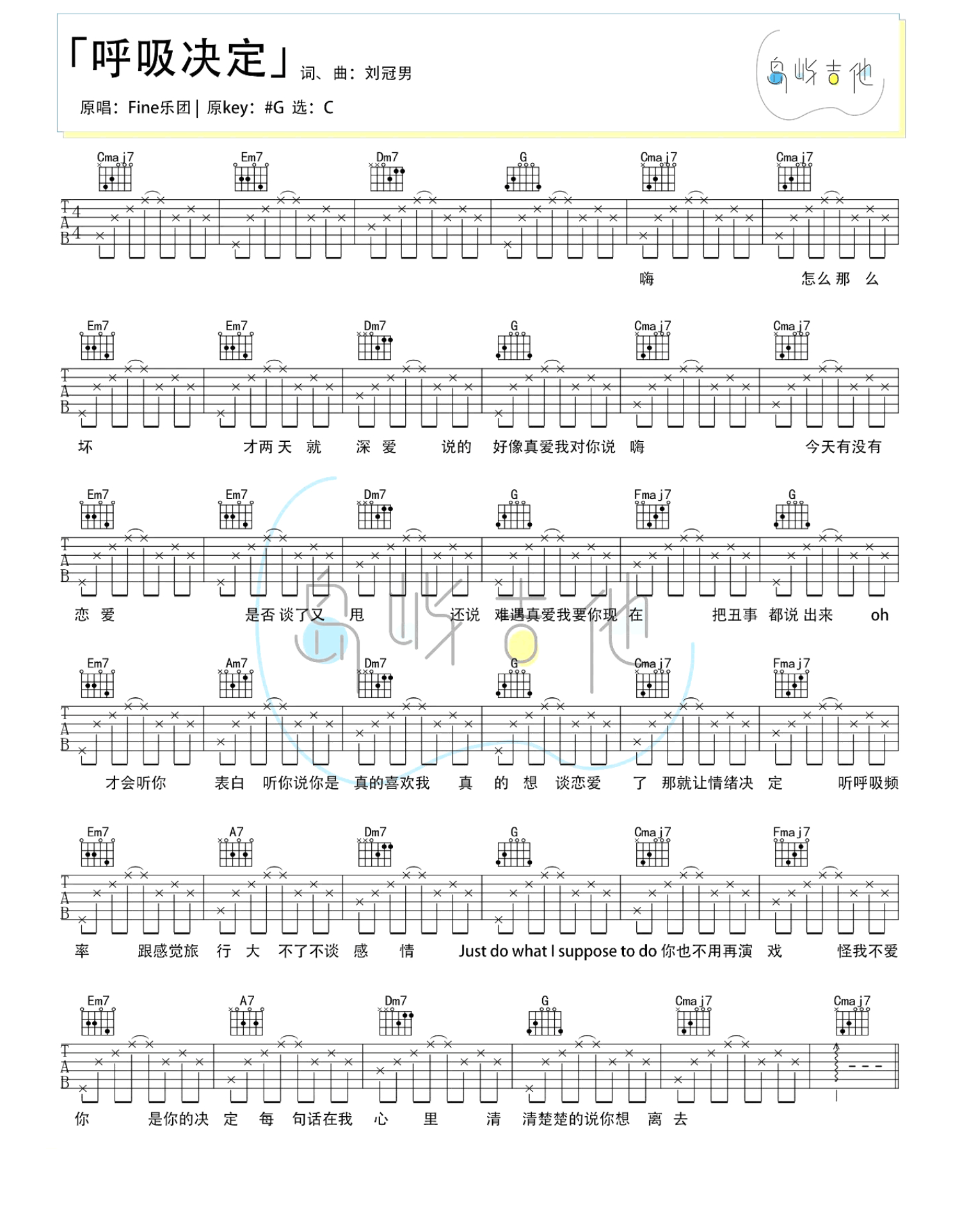曲谱介绍: Fine乐队《呼吸决定》吉他谱_C调吉他弹唱谱
