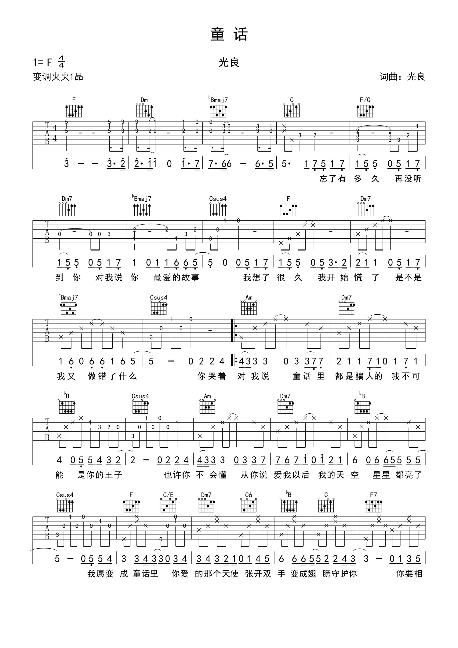 • 童话吉他谱 - 光良 - F调吉他弹唱谱第1张