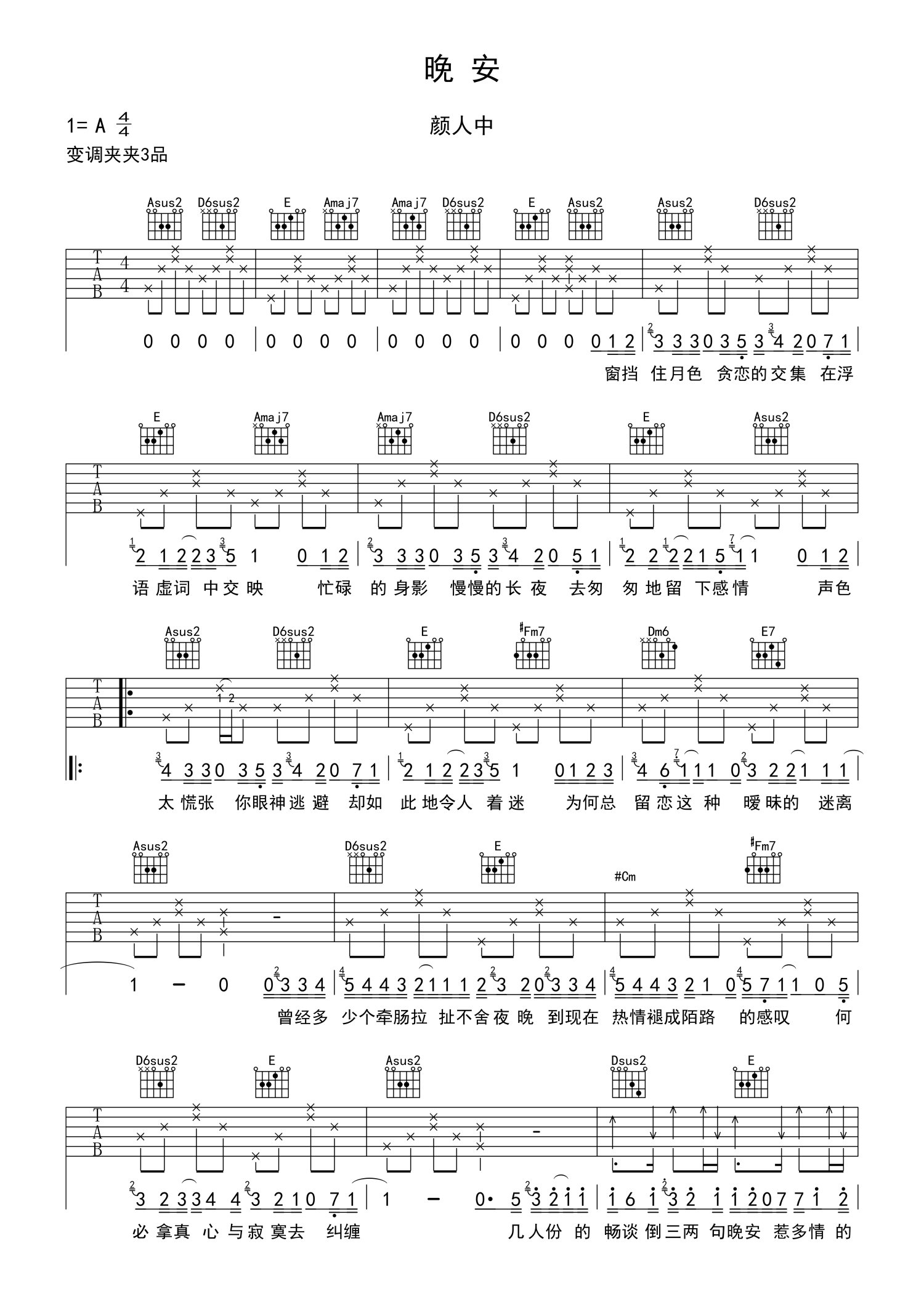 曲谱介绍: 颜人中《晚安》吉他谱_A调吉他弹唱谱