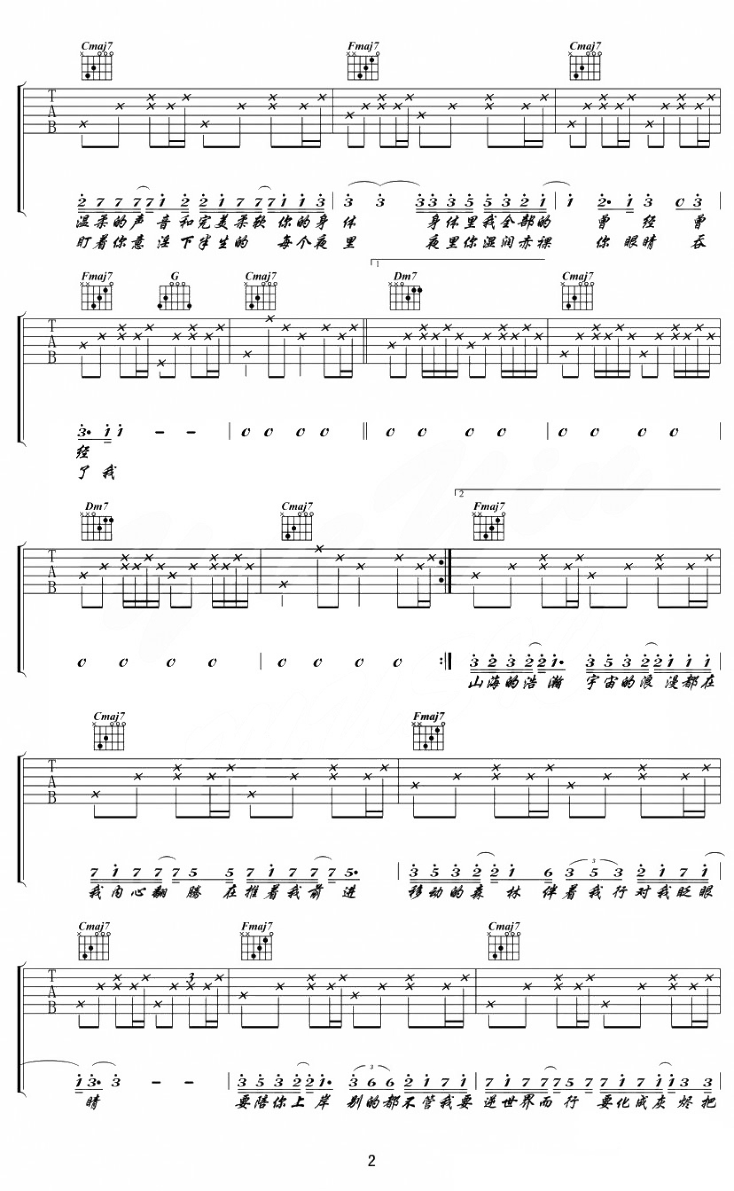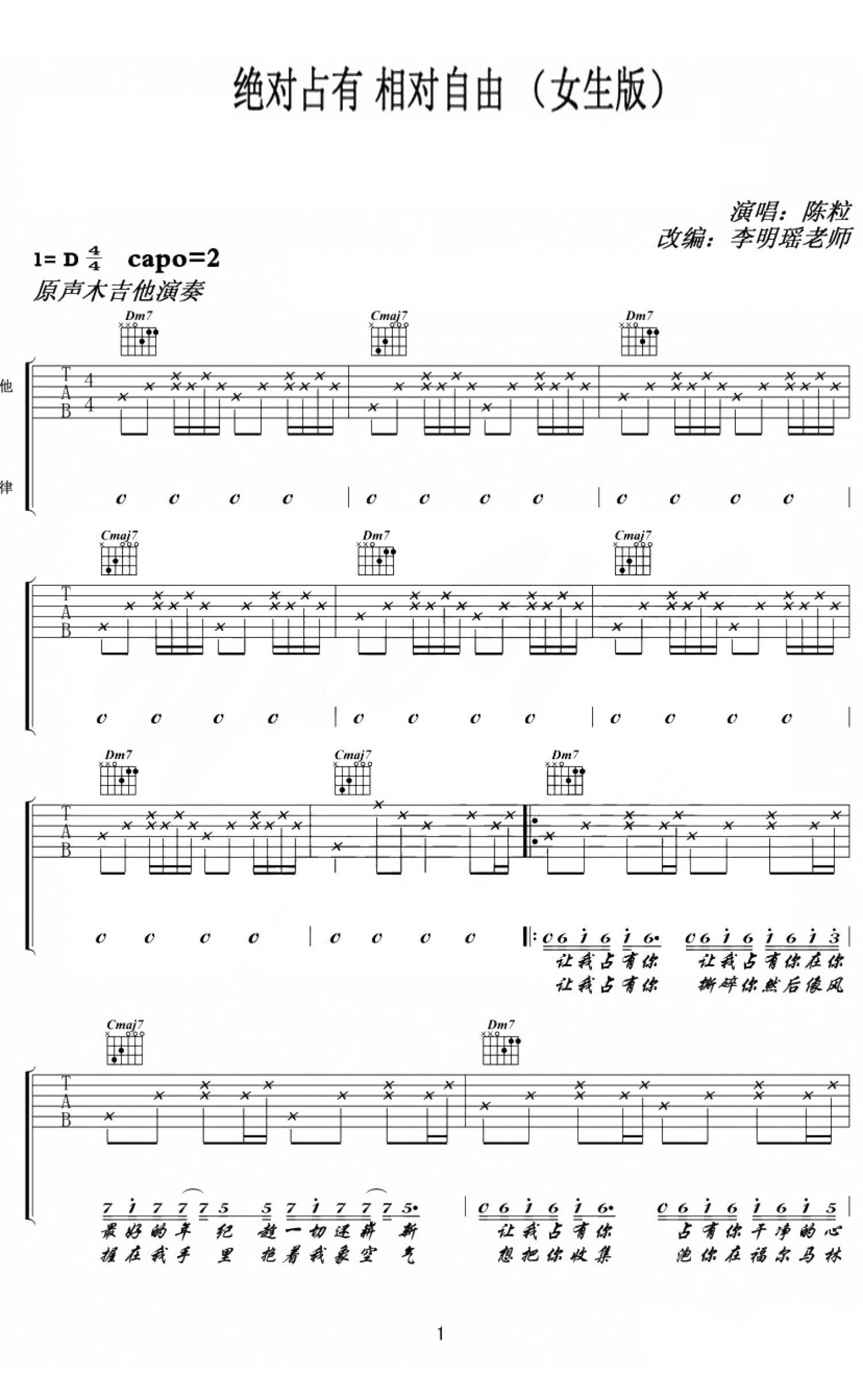 曲谱介绍: 陈粒《绝对占有相对自由》吉他谱,六线谱编配,这首歌曲旋律是典型的陈粒专属调调,歌曲却没有她一如既往的倔强而又婉转的民谣音色,只听到她轻声的吟唱,像是在对着恋人的耳朵诉说情话,柔软得告诉对方彼此专属的承诺,在温柔直白的情话中又体现出女生热恋中飞蛾扑火不顾一切的坚定。绝对占有相对自由吉他谱,陈粒演唱,《如也》专辑里面的一首歌曲,这首民谣感觉比《奇妙能力歌》的节奏要舒缓。绝对占有相对自由吉他弹唱谱,D调,capo2品,原声木吉他演奏
