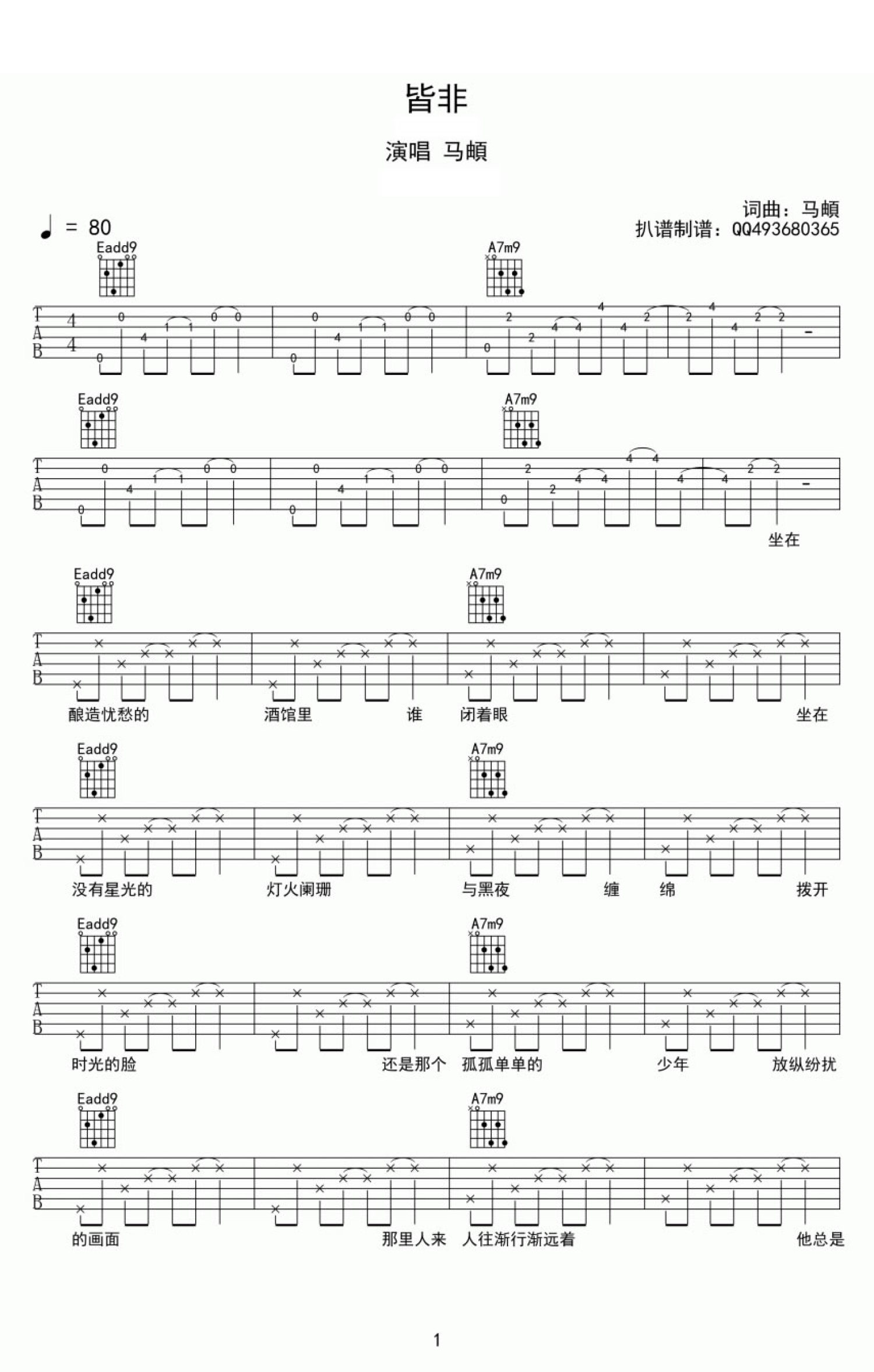 曲谱介绍: 皆非吉他谱,马頔词曲演唱的一首民谣创作新歌,皆非吉他六线谱,图片谱高清版。“遥不可及的相守咫尺天涯的相拥,在繁华落空时它们相逢,来做一场灰飞烟灭的游戏信马由缰飘零半生。”一生中有太多的相逢别离,多年后,在你到不了的地方,我饮下的却是和你一起时的忧愁。少了年少的狂野不羁,多了些岁月的沉淀。一切皆非,活着已是最好,曾经皆非,皆非人生。马頔还是马頔,我还是我,民谣还是民谣,世界没变,民谣依然在路上。