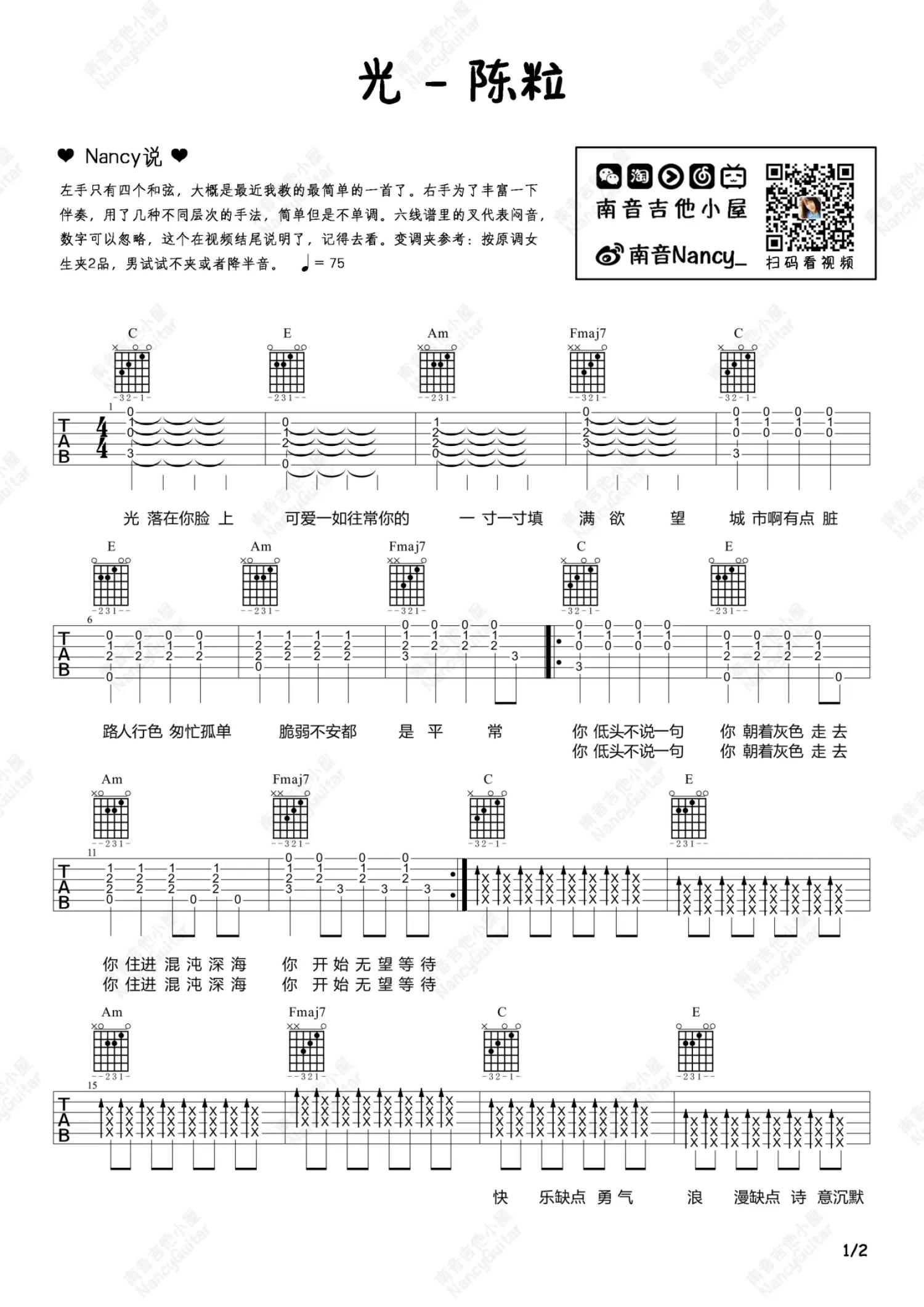 曲谱介绍: 陈粒《光》吉他谱_C调吉他弹唱谱
