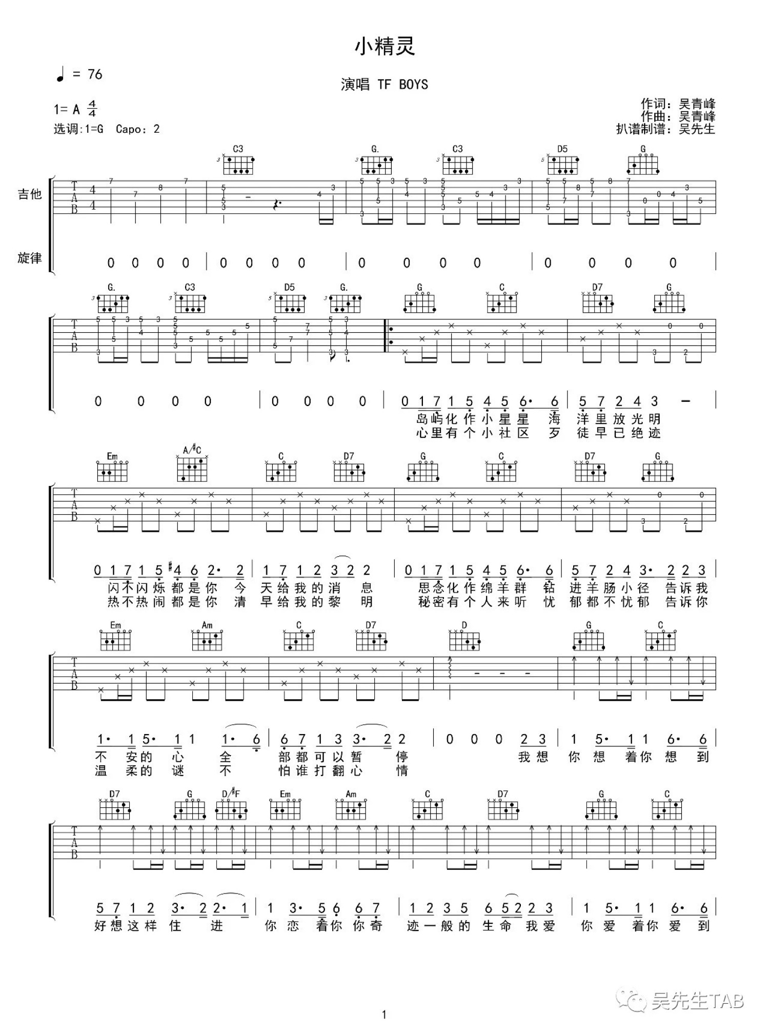 曲谱介绍: tfboys《小精灵》吉他谱_G调吉他弹唱谱
