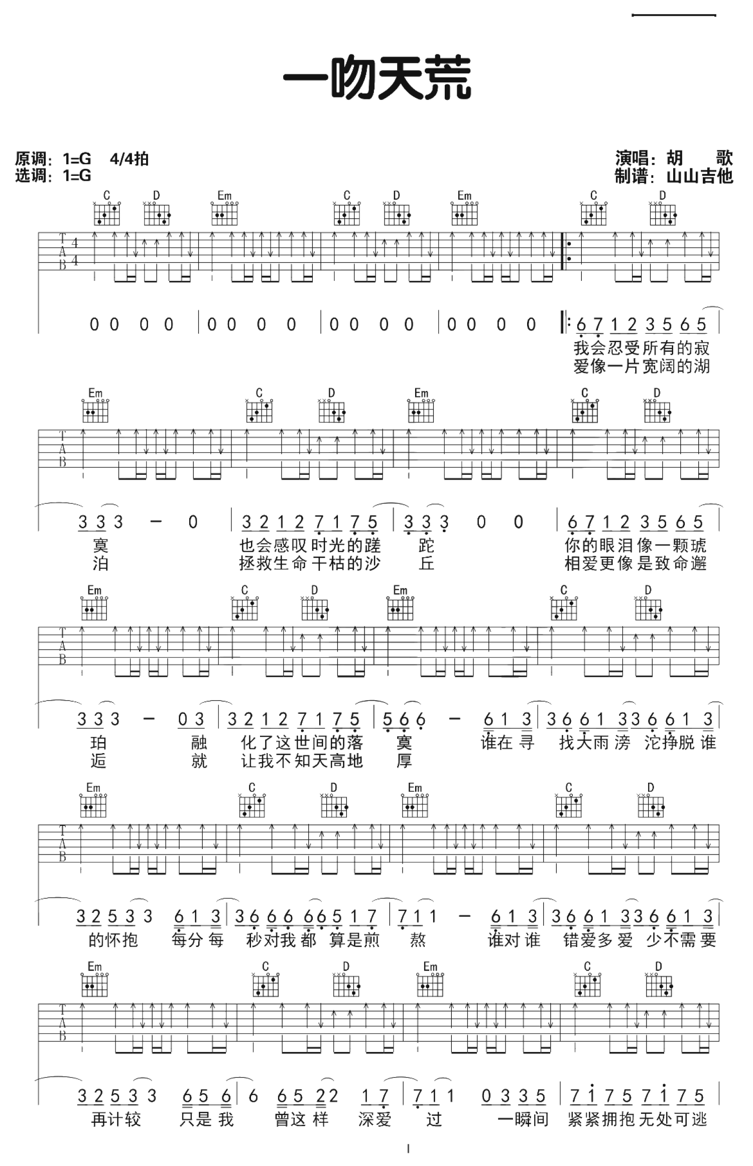 一吻天荒吉他谱 - 胡歌 - G调吉他弹唱谱