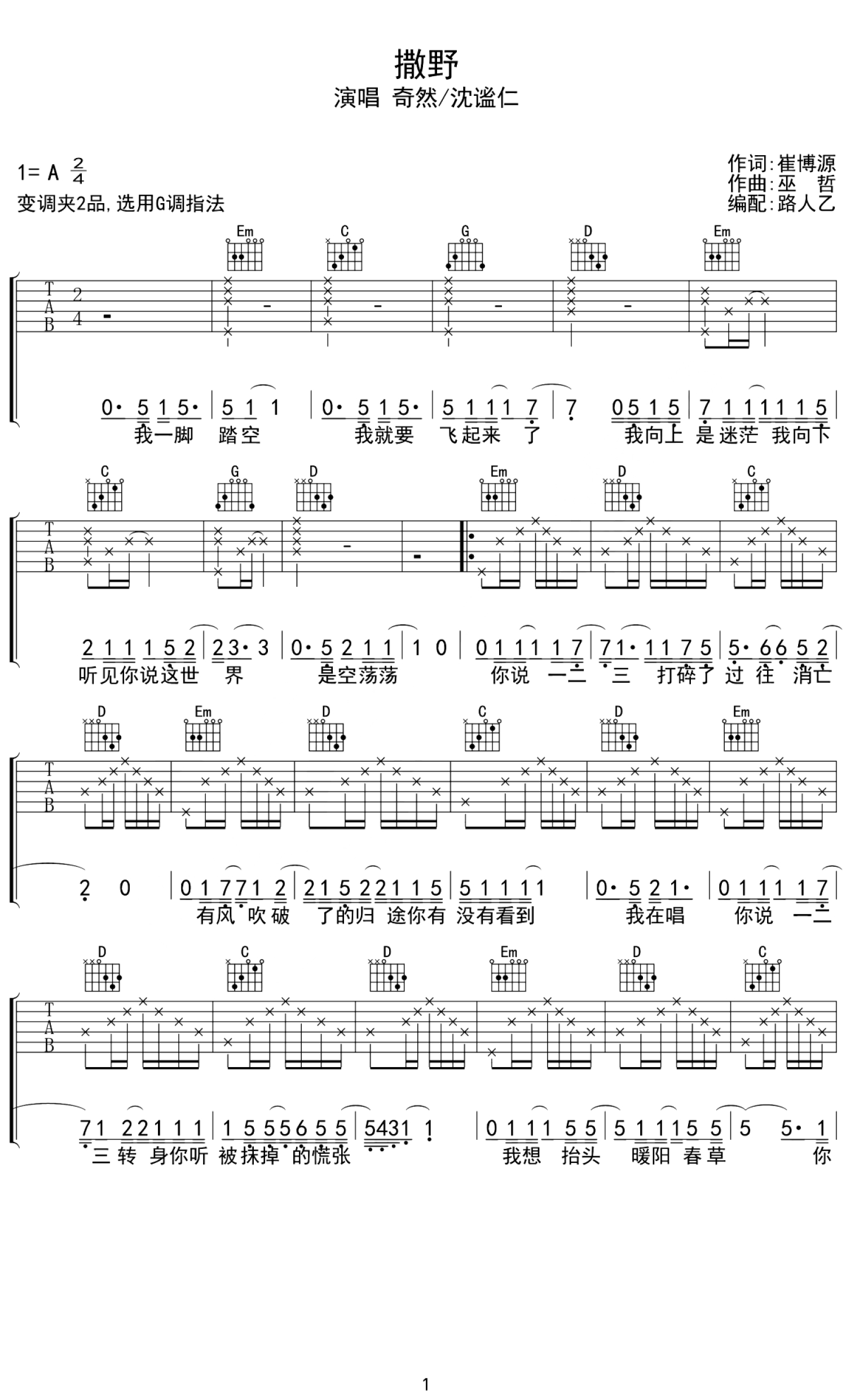 曲谱介绍: 奇然/沈谧仁《撒野》吉他谱_G调吉他弹唱谱