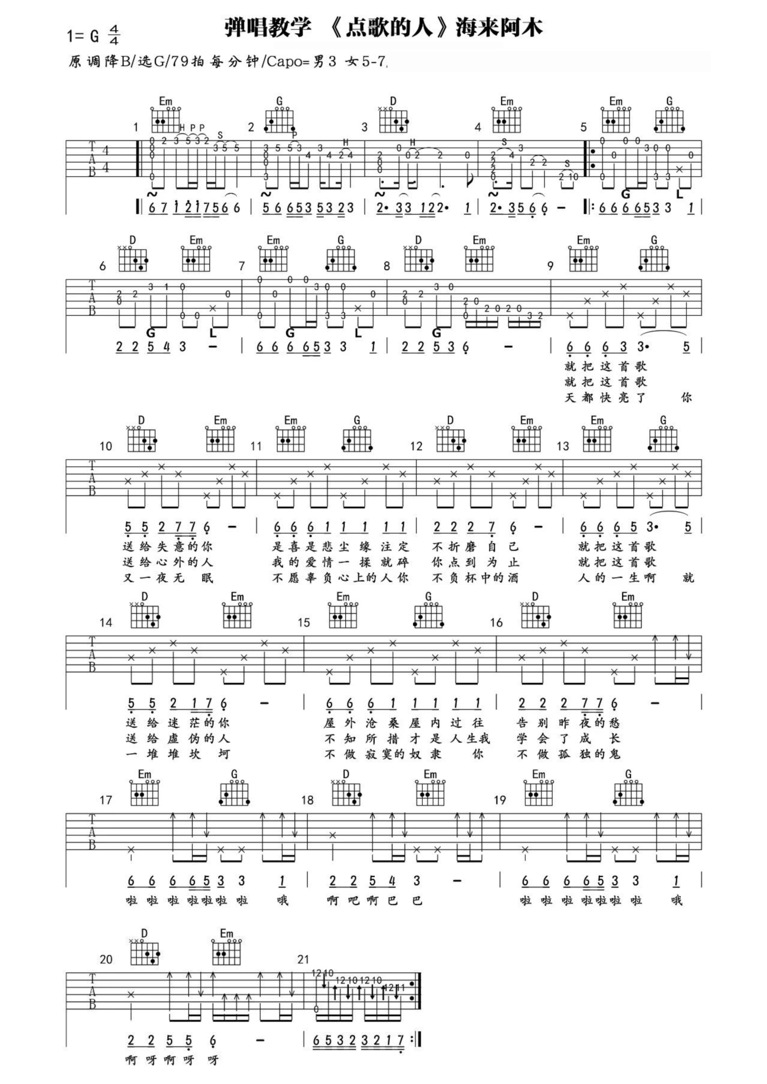 曲谱介绍: 点歌的人吉他谱,海来阿木的一首网络热门歌曲,点歌的人六线谱,原调降B选调G,变调夹推荐,男生3品女生5-7品。海来阿木《点歌的人》,仿佛一夜之间,这首歌风靡全网。一遍一遍地单曲循环,略带忧伤的旋律在周边萦绕,满含沧桑的歌声入耳入心,释解着灵魂的愁苦,舔舐着蕴藏在心底的忧郁。生活在大千世界,每个人都会有失意的时候,保持平常心,相信总会有柳暗花明的一天。