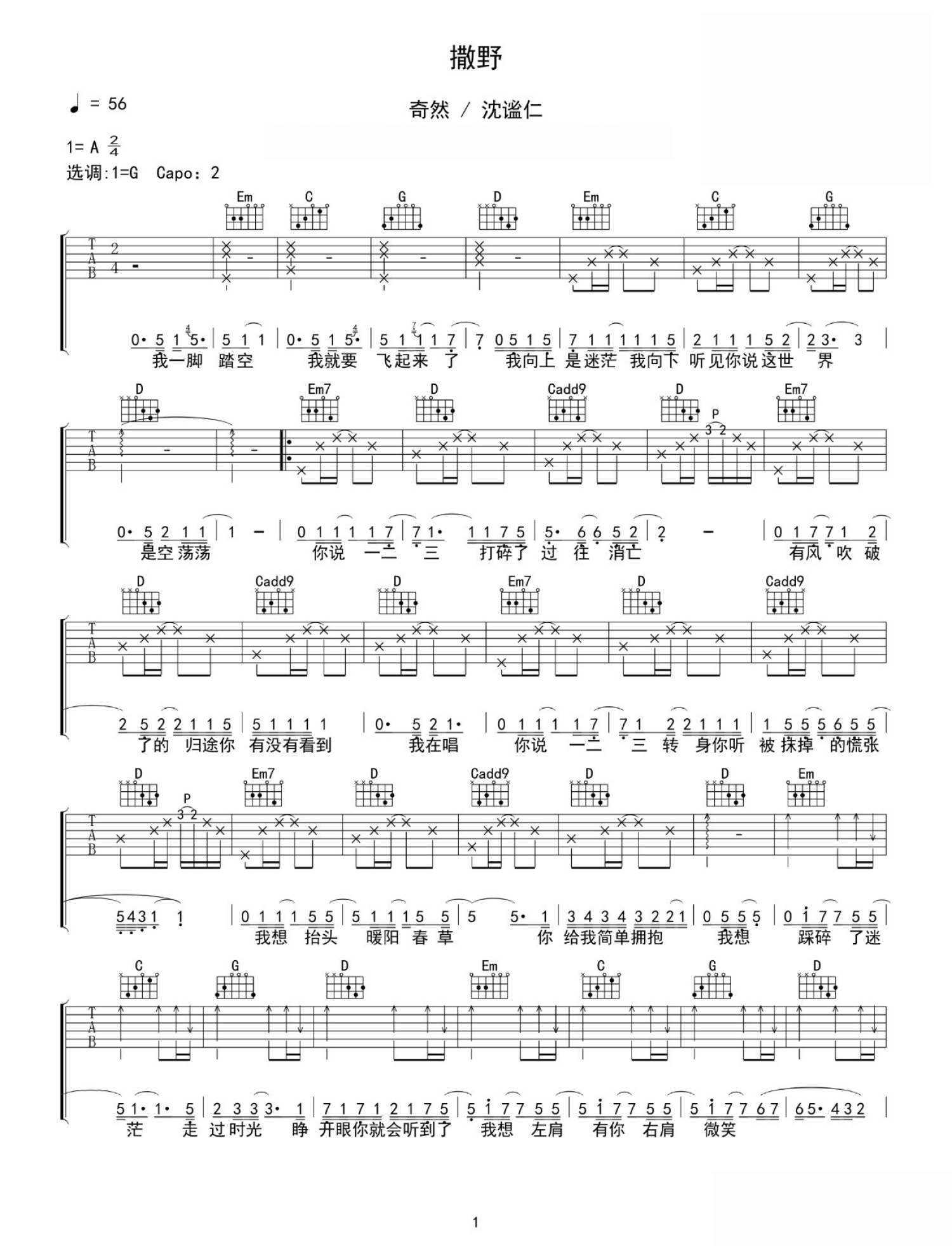 撒野吉他谱 - 奇然/沈谧仁 - G调吉他弹唱谱