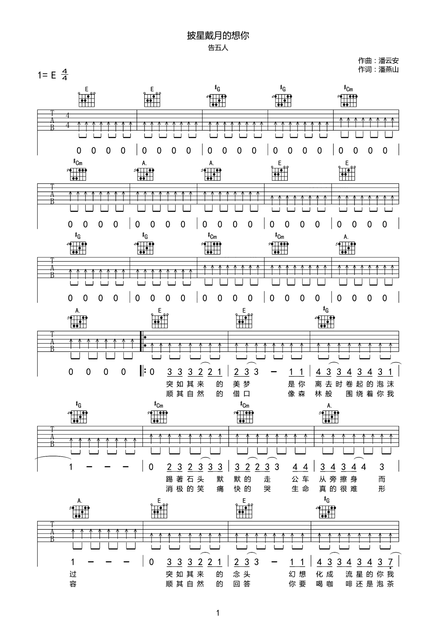 披星戴月的想你吉他谱 - 告五人 - E调吉他弹唱谱