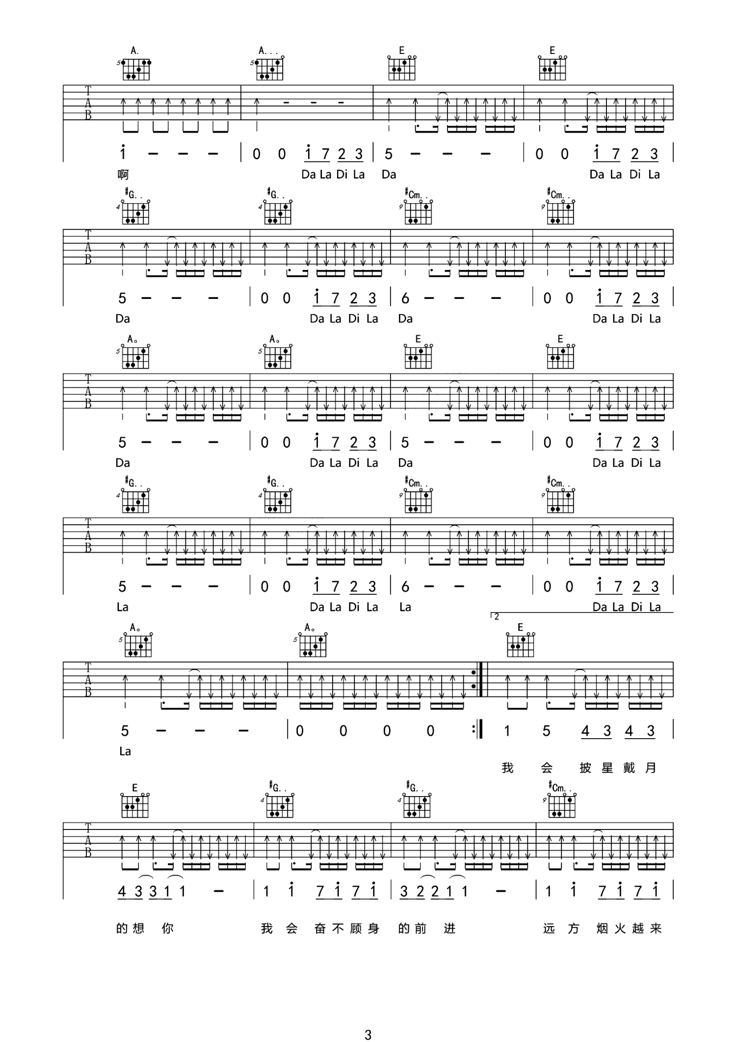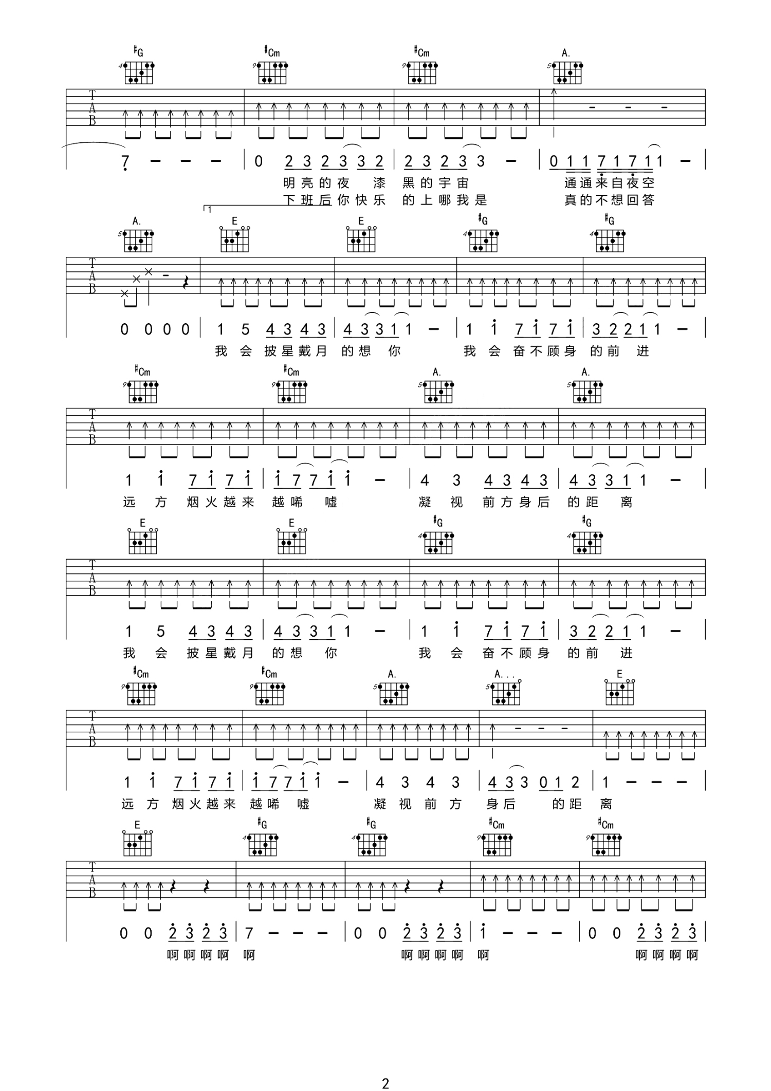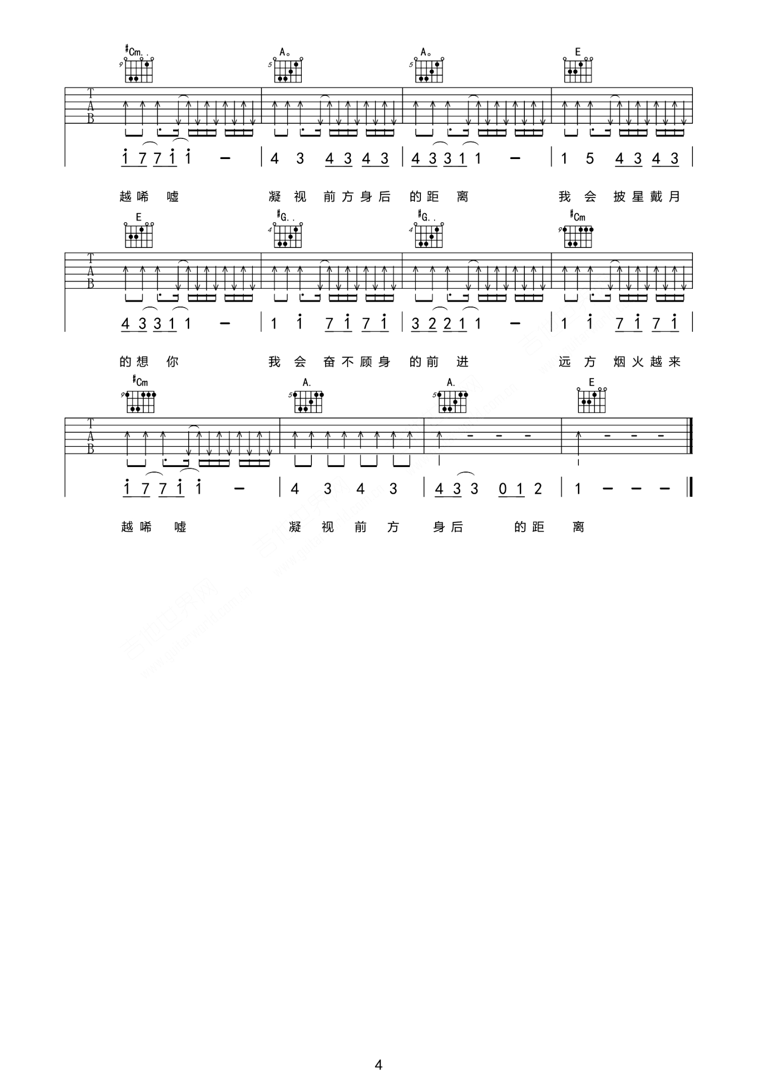 曲谱介绍: 告五人《披星戴月的想你》吉他谱_E调吉他弹唱谱