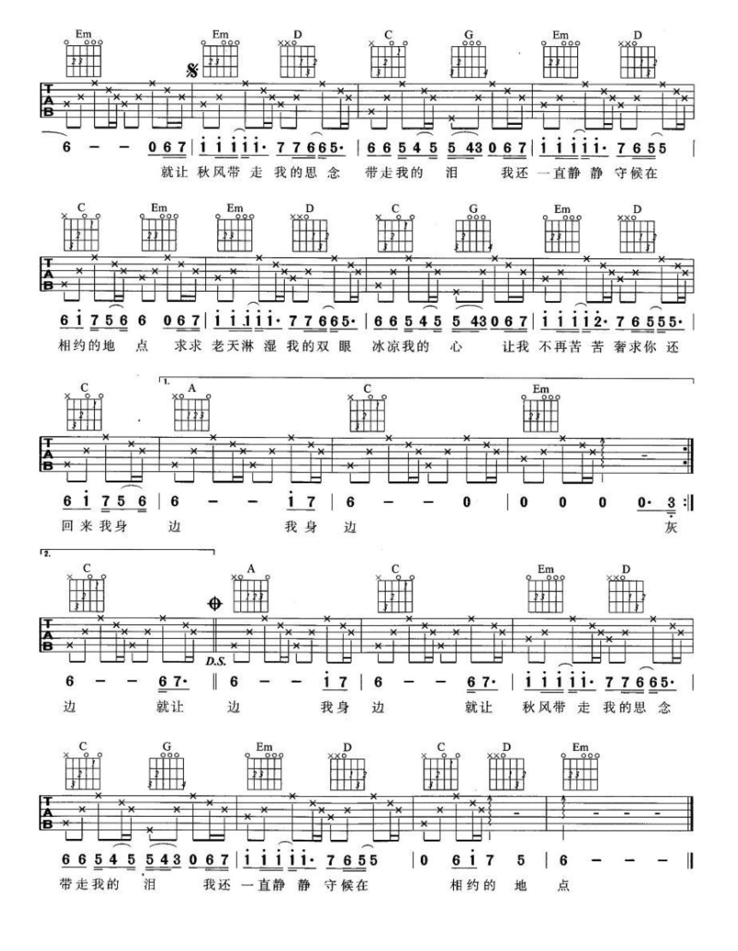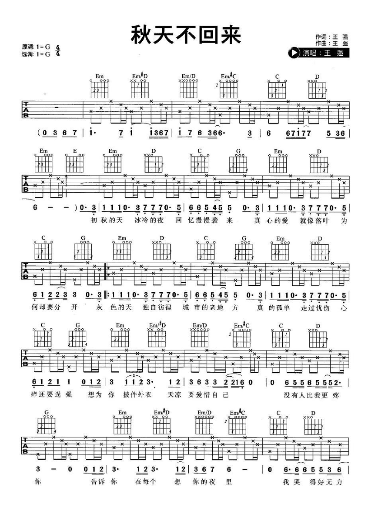 曲谱介绍: 王强《秋天不回来》吉他谱_G调吉他弹唱谱