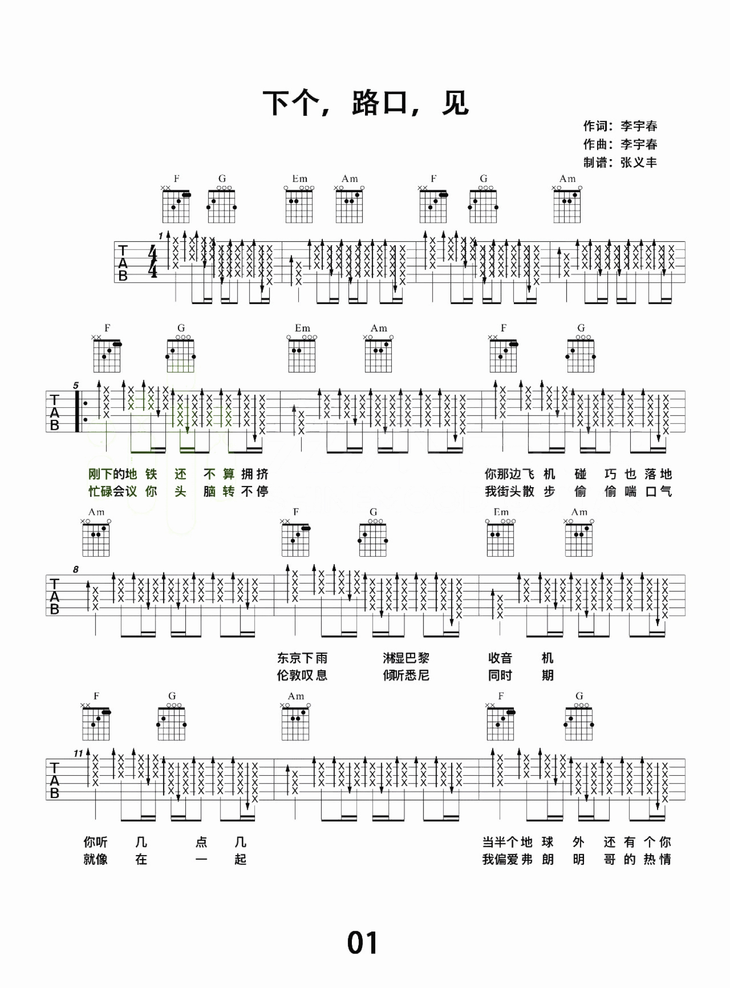 下个路口见吉他谱 - 李宇春 - C调吉他弹唱谱