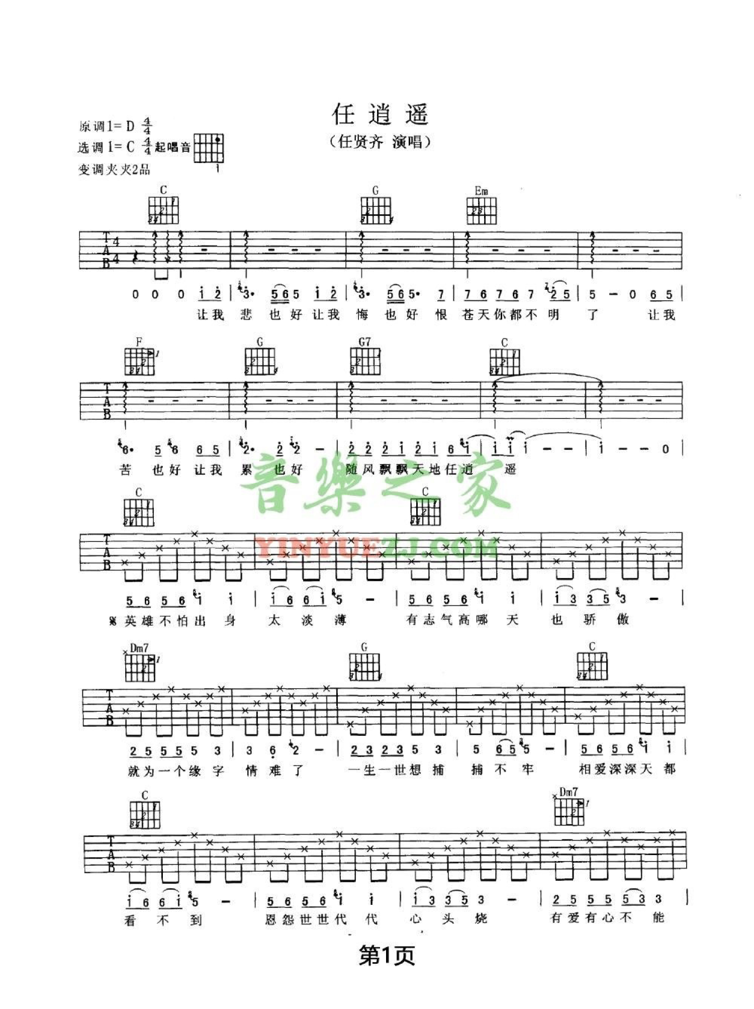 曲谱介绍: 任贤齐《任逍遥》吉他谱_C调吉他弹唱谱